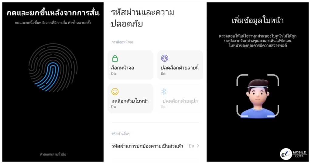 ระบบปลดล็อกหน้าจอ | สแกนนิ้ว, สแกนใบหน้า, รหัสผ่าน |