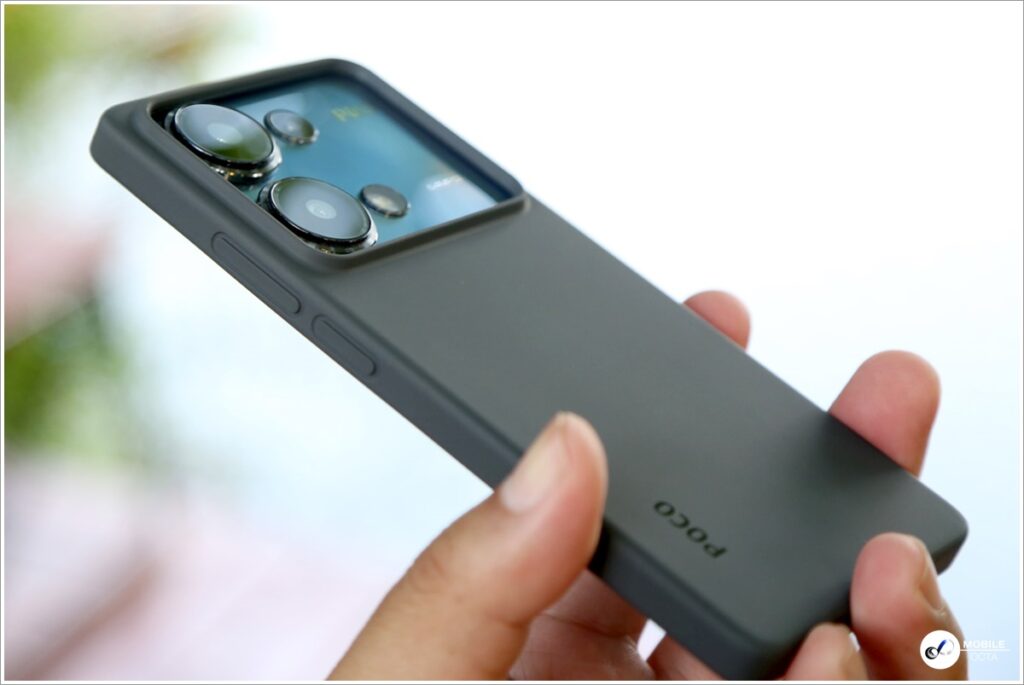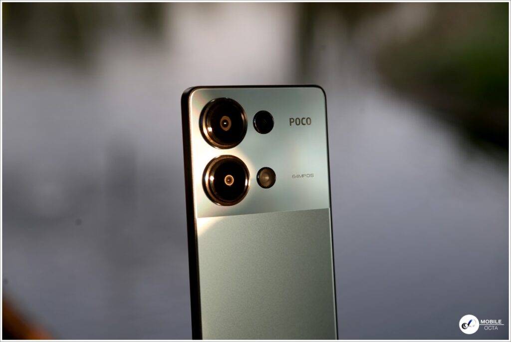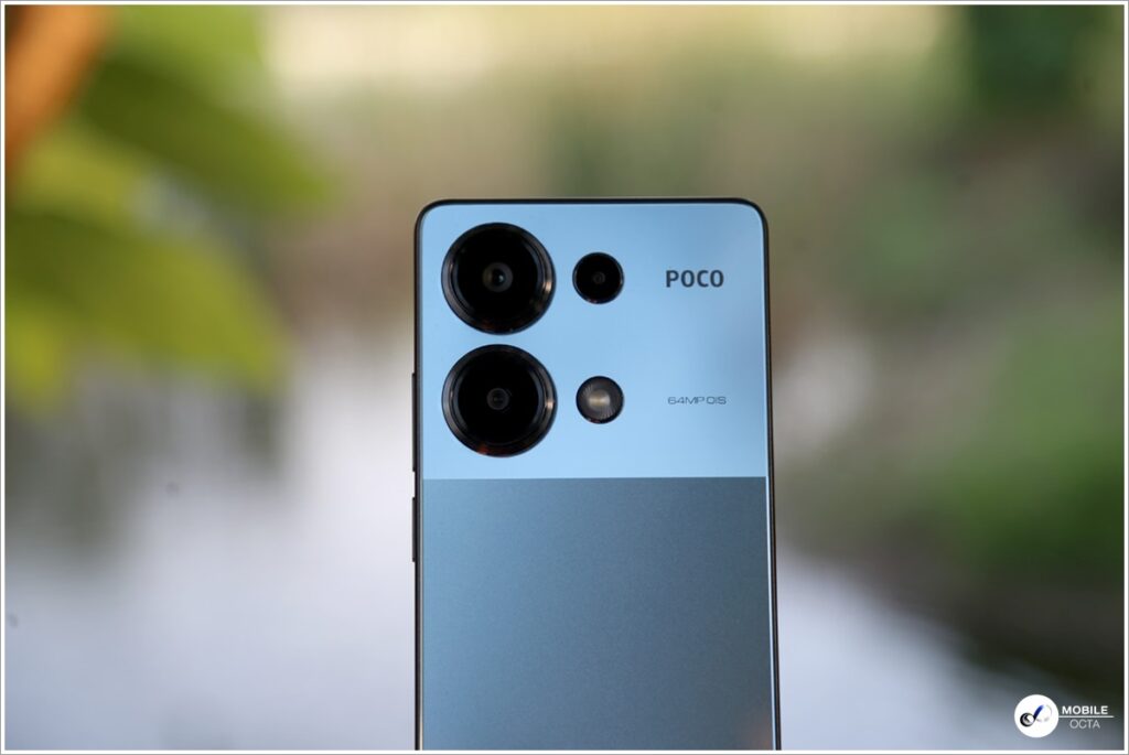 การออกแบบบริเวณกล้องก็ดูโดดเด่นครับ โดยฝาหลังมีการแบ่งออกเป็น 2 โซน คือ ด้านบนจะเป็นดีไซน์แบบมันเงาและมีการวางกล้องในบริเวณนี้ โดยแบ่งออกเป็นวงกลมขนาดใหญ่ 2 วง และมีวงเล็กและไฟแฟลช LED พร้อมโลโก้ POCO และ 64MP OIS บ่งบอกคุณสมบัติหลักของกล้องถ่ายภาพ