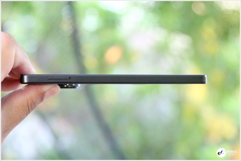 ในขณะที่ด้านซ้ายจะเป็นถาดใส่ซิมการ์ด ซึ่งรุ่นนี้จะรองรับ 2 ซิมการ์ด และจะรองรับ microSD Card ด้วย แต่ต้องเลือกระหว่างจะใส่การ์ดความจำหรือว่าซิมสองครับ