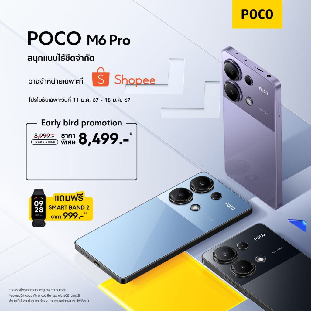 นอกจากนี้ พิเศษสำหรับลูกค้าที่ซื้อ POCO M6 Pro รุ่นความจุ 12GB+512GB ในช่วงวันที่ 11-18 มกราคม 2567 รับฟรี! สายรัดข้อมืออัจฉริยะ Smart Band 2 มูลค่า 999 บาท อีกด้วย