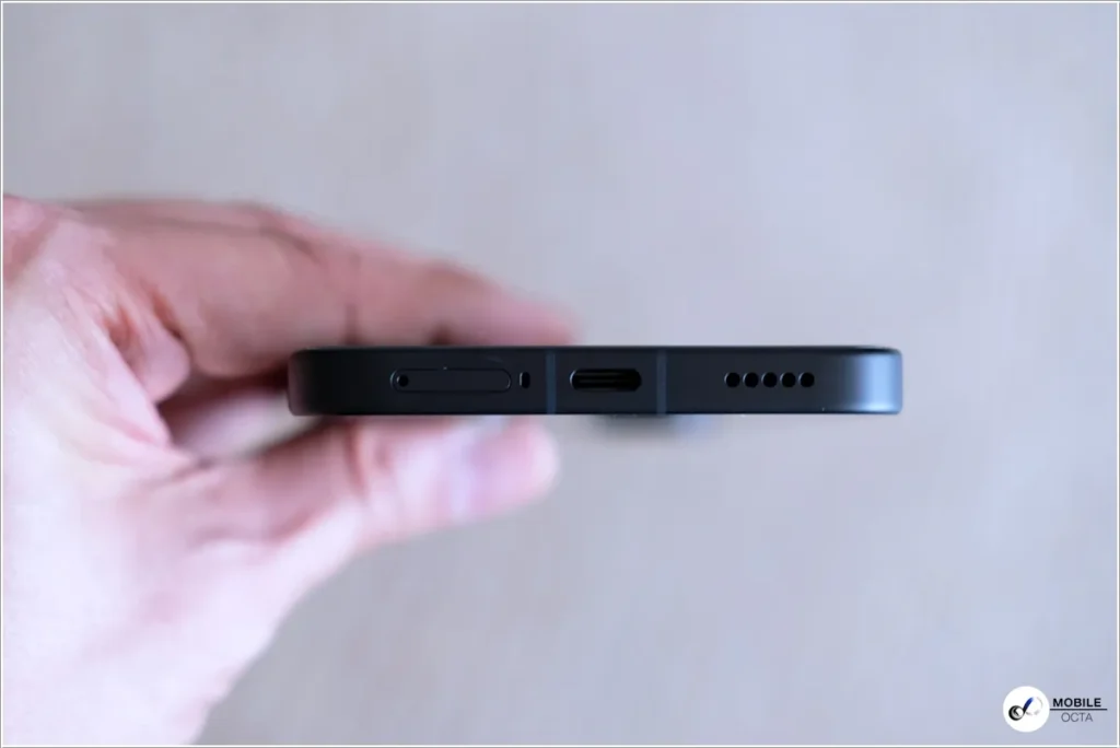 ด้านท้ายเครื่อง มีช่องใส่ซิมการ์ด, ช่องไมโครโฟนสนทนา, พอร์ต USB Type-C และช่องลำโพงเสียง