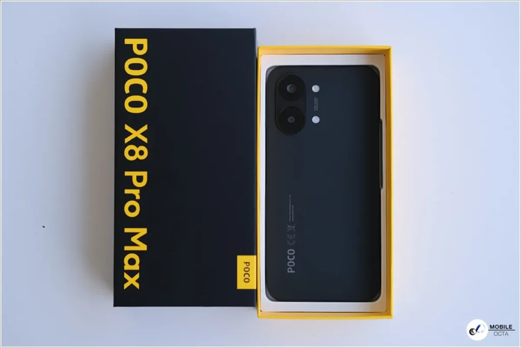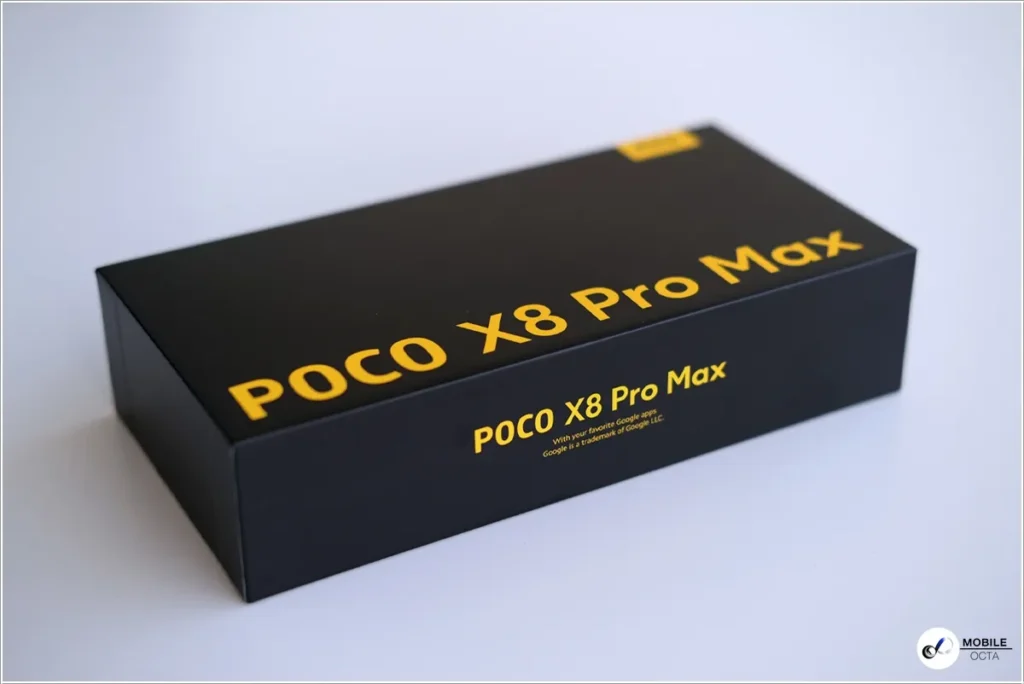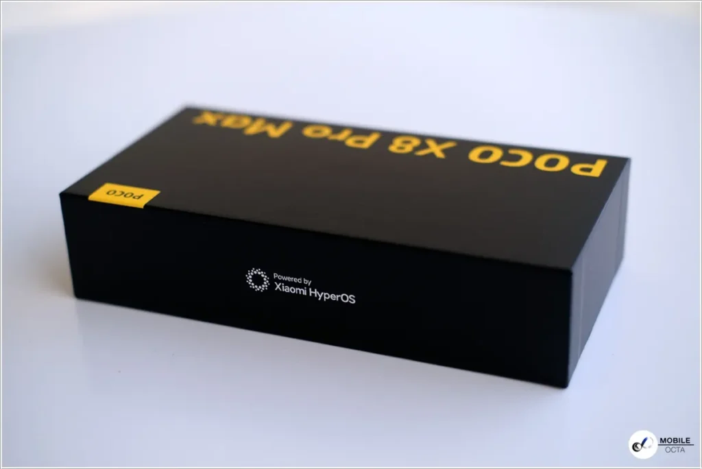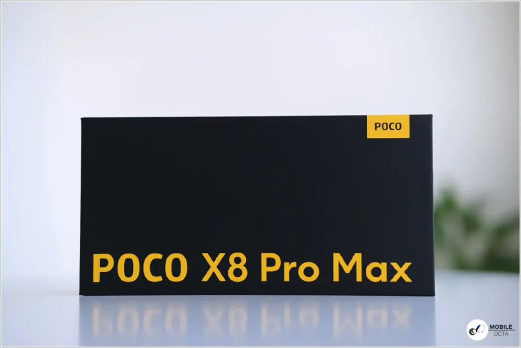 กล่องบรรจุภัณฑ์ของ POCO X8 Pro Max เป็นกล่องกระดาษแข็งสีดำ ด้านหน้ากล่องมาพร้อมโลโก้ และชื่อรุ่นขนาดใหญ่พิมพ์สีเหลือง