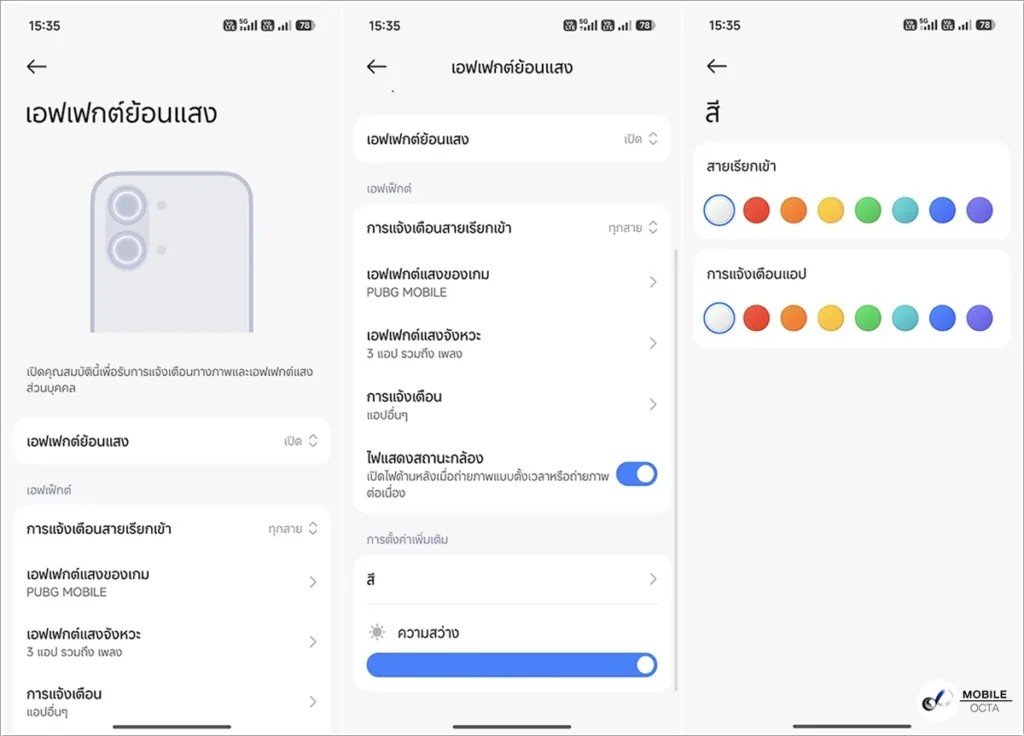 และตรงบริเวณโมดูลกล้องด้านหลังจะมีแถบไฟ Dynamic RGB Light ซ่อนอยู่ ซึ่งสามารถปรับแต่งสีได้ถึง 8 สี โดยไฟนี้ไม่ได้มีไว้แค่โชว์ความเท่ แต่จะกะพริบตอบสนองแบบเรียลไทม์กับจังหวะต่าง ๆ เช่น: