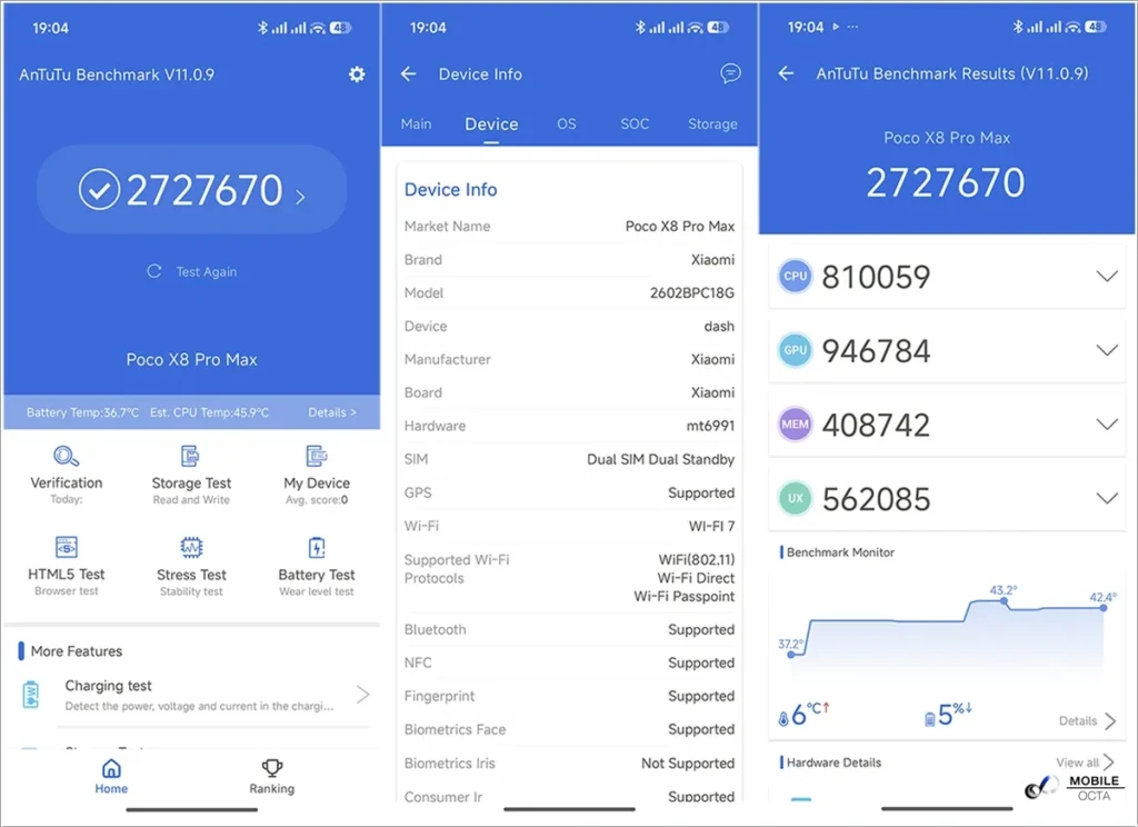 เรียกได้ว่าเป็น “นักฆ่าเรือธง” ตัวจริง เพราะ POCO X8 Pro Max ขับเคลื่อนด้วยขุมพลัง MediaTek Dimensity 9500s สถาปัตยกรรม 3nm เจนเนอเรชันที่ 2 ที่มีโครงสร้าง CPU แบบ All-Big-Core ดันความเร็วคล็อกได้สูงสุดถึง 3.73GHz ซึ่งจากข้อมูลการทดสอบของ POCO Internal Labs สามารถทำคะแนน AnTuTu V11 ทะลุ 3,085,998 คะแนน