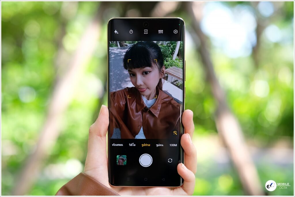 ส่วนอินเทอร์เฟซกล้องหลังของ realme 11 Pro 5G ด้านบนมีแถบเมนูเปิด/ปิดไฟแฟลชอัตโนมัติ, ตั้งเวลาถ่ายอัตโนมัติ, เปิด/ปิดโหมดการปรับแต่งฉากหลังด้วย AI, เลือกอัตราส่วนภาพถ่าย, เปิด/ปิดโหมด HDR อัตโนมัติ และตั้งค่าการใช้งานกล้องต่างๆ
