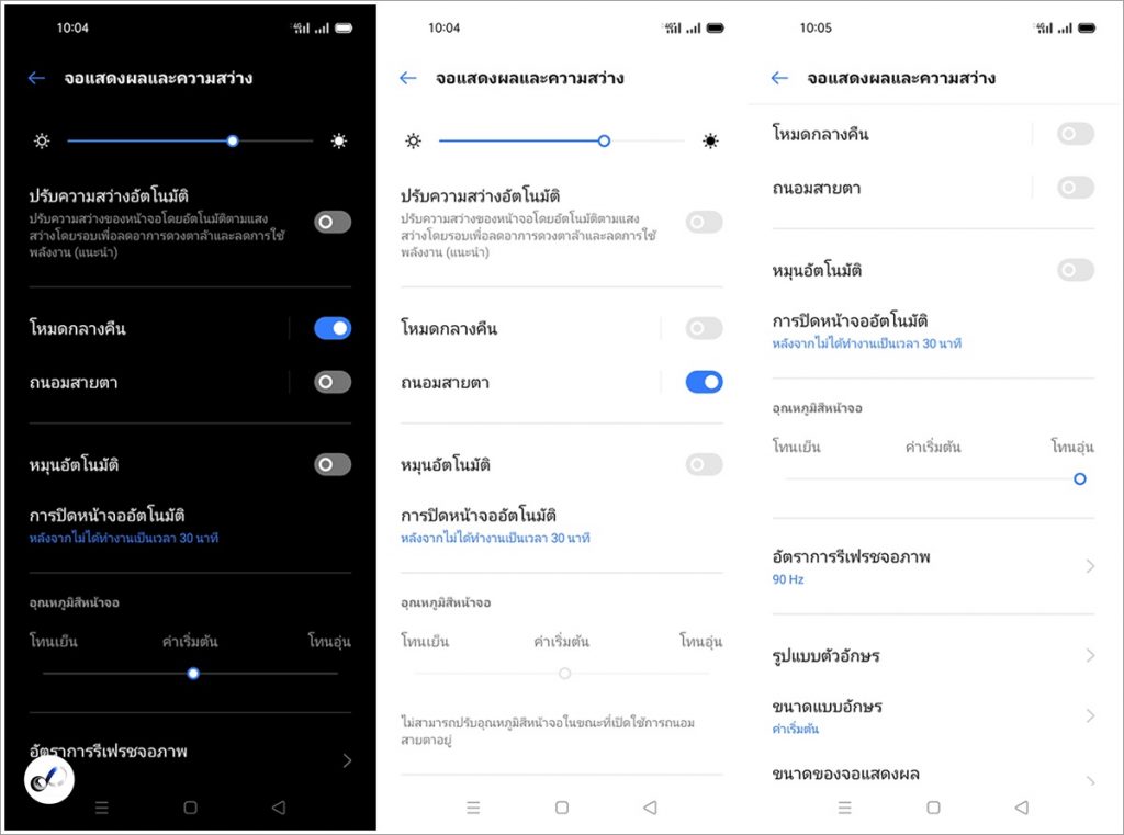 มาพร้อม Dark Mode หรือโหมดกลางคืน สำหรับปรับสีของหน้า UI ให้อยู่ในโทนสีดำ เพื่อช่วยให้ใช้งานได้อย่างสบายตามากยิ่งขึ้น โดยเฉพาะการอ่านหนังสือ และยังทำให้เครื่องใช้พลังงานน้อยลงช่วยยืดอายุแบตเตอรี่ด้วย พร้อมกับโหมดถนอมสายตา และปรับอุณหภูมิสีหน้าจอได้ โดยการเพิ่มอุณหภูมิสีเพื่อลดรังสีแสงสีฟ้า เพื่อป้องกันอาการปวดตา และสามารถตั้งเวลา เปิด-ปิด อัตโนมัติ