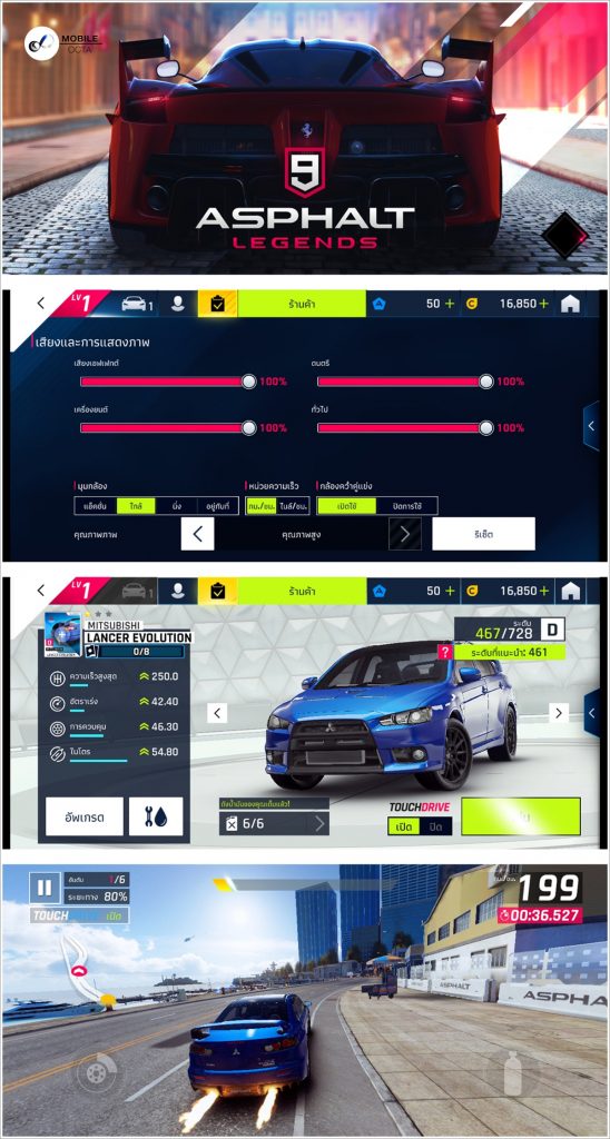 Asphalt 9 เลือกปรับกราฟิกคุณภาพสูง สามารถเล่นได้ แต่จะหน่วง ๆ หน่อย ต้องปรับเป็นค่าเริ่มต้น ก็จะพบกับความลื่นไหล ในภาพรวมก็ถือว่าทำได้ดีในระดับหนึ่ง