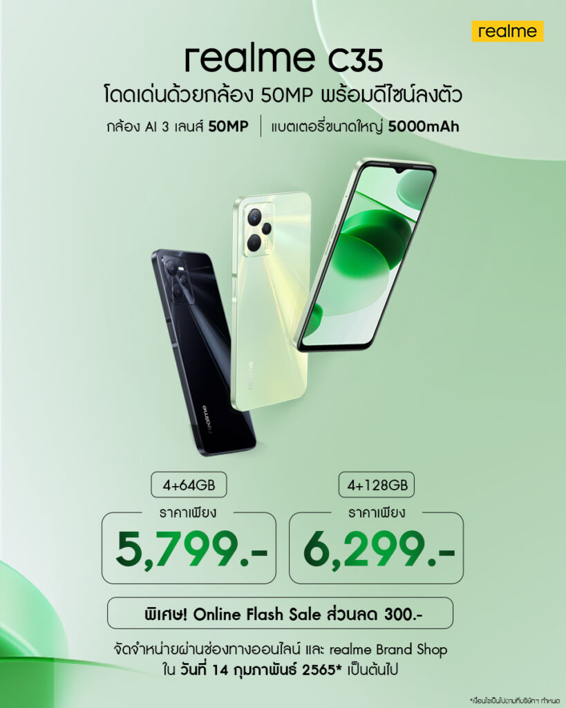 เตรียมเป็นเจ้าของ realme C35 กับดีไซน์สุดล้ำใน 2 โทนสี ได้แก่ Glowing Black และ Glowing Green ตามรายละเอียดดังนี้
