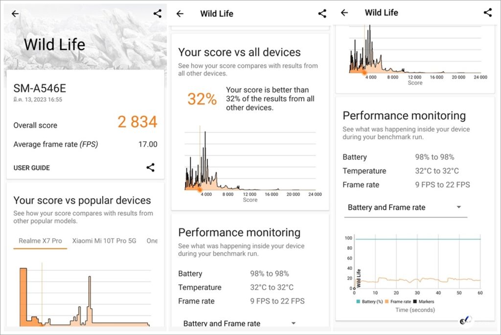 ส่วนการเล่นเกมบน Samsung Galaxy A34 5G ด้วยชิปนี้ก็ทำได้ดีไม่ผิดหวังครับ และได้เล่นบนหน้าจอใหญ่เต็มตา 6.6 นิ้ว Super AMOLED 120Hz อัปเกรดจาก 90Hz บนรุ่นเดิม ทำให้สมาร์ตโฟนรุ่นนี้เป็นอีกหนึ่งมือถือราคาหมื่นต้นที่มีหน้าจอที่ดีที่สุดในตลาดตอนนี้ครับ และสมาร์ตโฟนทั้งสองรุ่นยังมาพร้อมกับระบบสัมผัสแป้นพิมพ์ มอเตอร์สั่น (Haptic) ใหม่ที่ดีกว่าเดิม โดยรุ่นใหม่ใช้ระบบ Linear ที่ดีกว่า DC motor ในรุ่นเดิมด้วยครับ