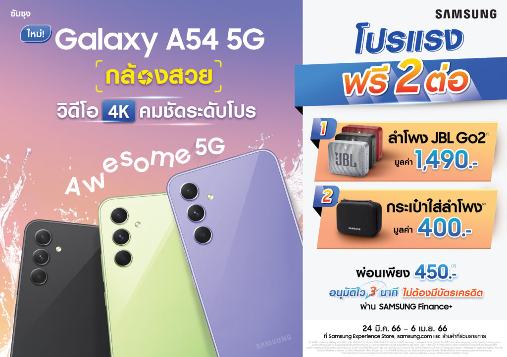โปรโมชั่นเปิดขาย Samsung Galaxy A54 5G รับโปรแรงฟรี 2 ต่อ ลำโพง JBL Go2 พร้อมกระเป๋า มูลค่า 1,890 บาท ระหว่างวันที่ 24 มีนาคม 2566 – 6 เมษายน 2566 อย่ารอช้า รีบพุ่งตัวไปจับจองด่วนที่ samsung.com, Samsung Experience Store และร้านค้าที่ร่วมรายการ