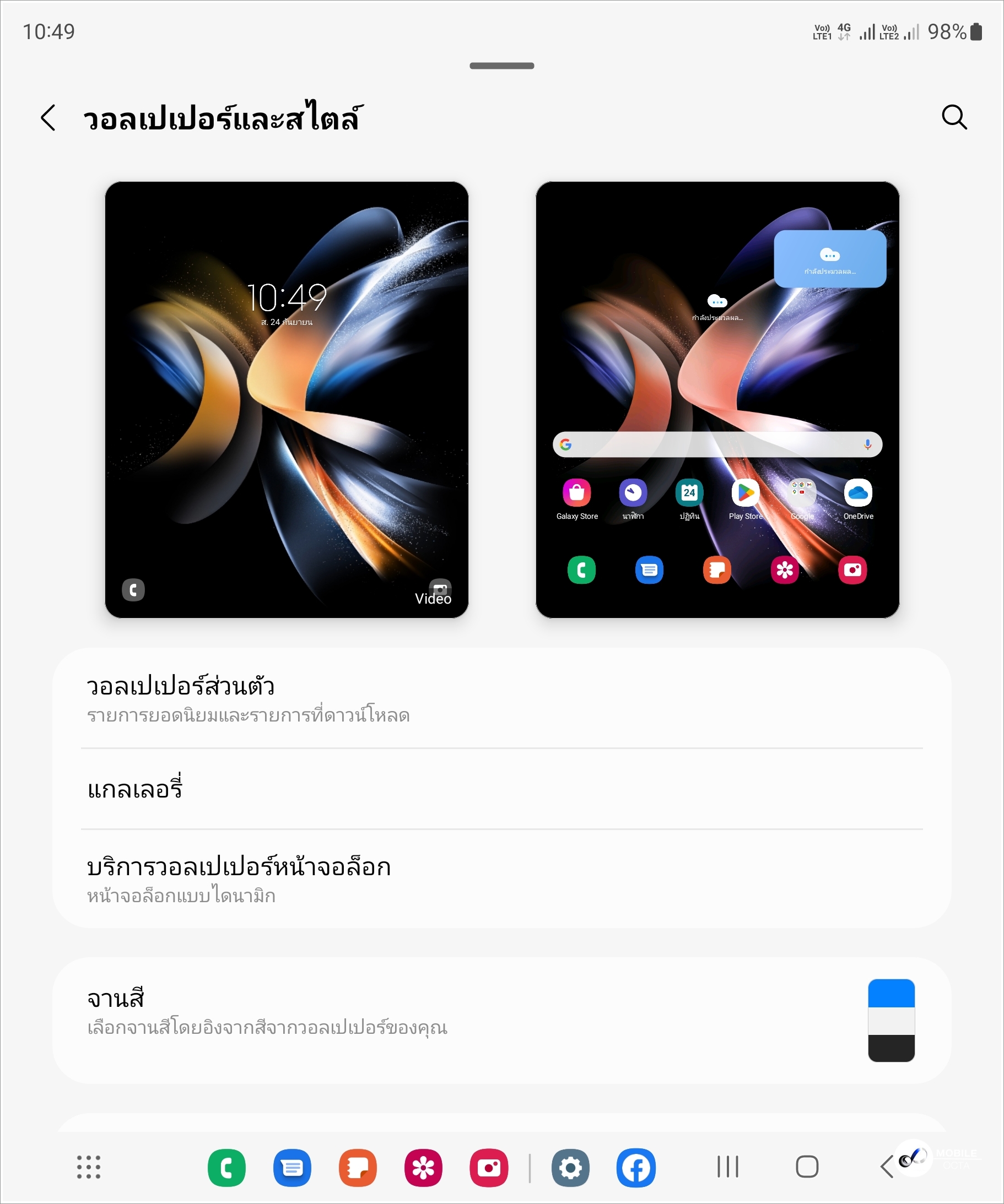 นอกจากนี้ตัว UI จะมีการปรับแยกส่วนกันชัดเจนระหว่างหน้าจอด้านนอกกับหน้าจอด้านใน ทั้งการวางไอคอนแอป Widget หรือ Wallpaper ซึ่ง UI ด้านนอกก็จะเหมือนสมาร์ตโฟนทั่วไป ส่วนด้านในทั้งหน้า Setting หรือการใช้งานแอปอื่น ๆ ก็จะเป็นแบบแท็บเล็ตไปเลย เหมือนเรามีทั้งสมาร์ตโฟนจอเล็กและแท็บเล็ตอยู่ในร่างเดียวกันเลยครับ