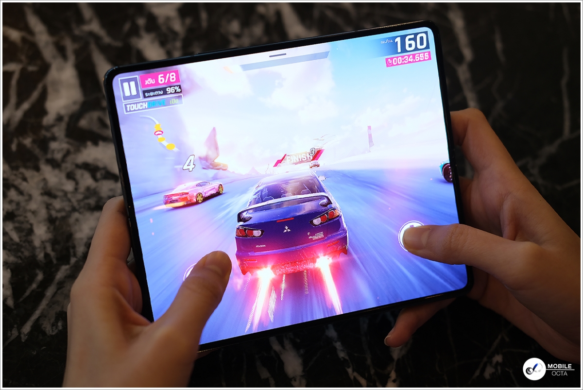 เริ่มที่ Asphalt 9 เกมแข่งรถที่มีภาพสุดสวยกันก่อน โดยตั้งค่าคุณภาพภาพระดับสูง ซึ่งถ้าเล่นด้านหน้าจอแสดงผลก็จะเห็นมุมมองที่กว้างแบบชัดเจน ทำให้เห็นได้เยอะ แต่จะเห็นรถยนต์คันเล็ก ขณะที่ถ้าเล่นบนหน้าจอแสดงผลด้านในที่กางหน้าจอออกมาก็จะเป็นอีกสัดส่วนหนึ่งเห็นรถยนต์ขนาดใหญ่ แต่ฉากในเกมจะเล็กลง โดยรวมแล้วสามารถเล่นได้ลื่นไหลดีมาก และสามารถสลับสลับไปเล่นในแบบหน้าจอหลักหรือจอนอกได้แบบทันทีโดยที่ไม่ต้องกดออกจากเกม