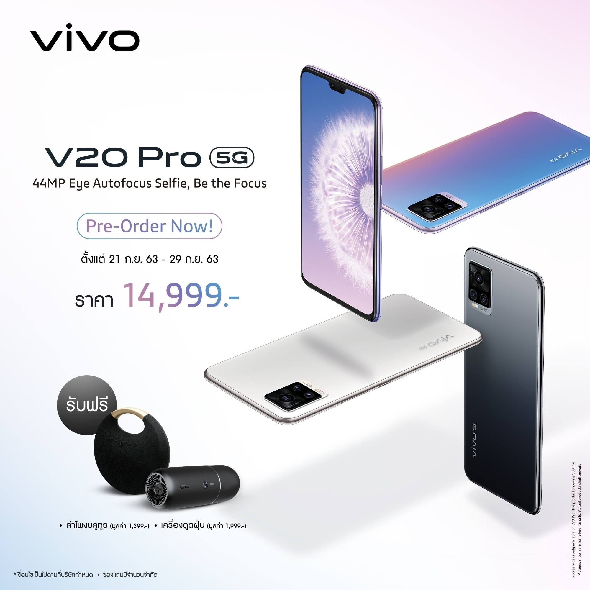 Vivo V20 pro 5G เปิดให้ Pre-Oder แล้วตั้งแต่วันที่ 21 ก.ย. – 29 ก.ย 63 ในราคาเพียง 14,999 บาท ที่ Vivo Brand Shop ทุกสาขา ตัวแทนจำหน่ายทั่วประเทศ โดยผู้ที่สั่งจองล่วงหน้าจะได้รับฟรี ลำโพงบลูทูธมูลค่า 1,399 บาท และเครื่องดูดฝุ่นมูลค่า 1,999 บาท นอกจากนี้ยังมีโปรโมชั่นจากทาง AIS และ TrueMove H กับราคาพิเศษเริ่มต้นเพียง 4,989 บาท