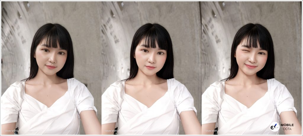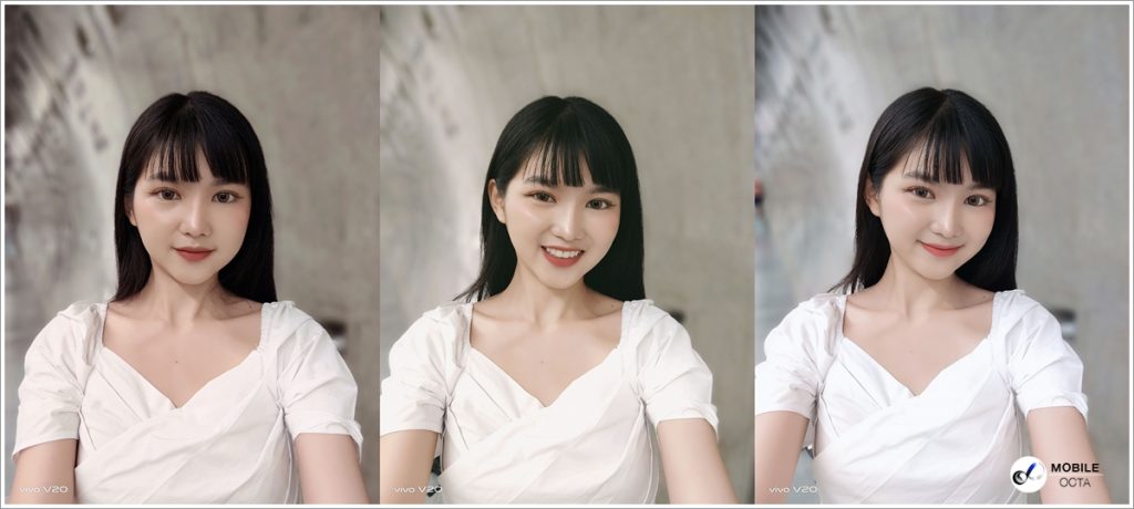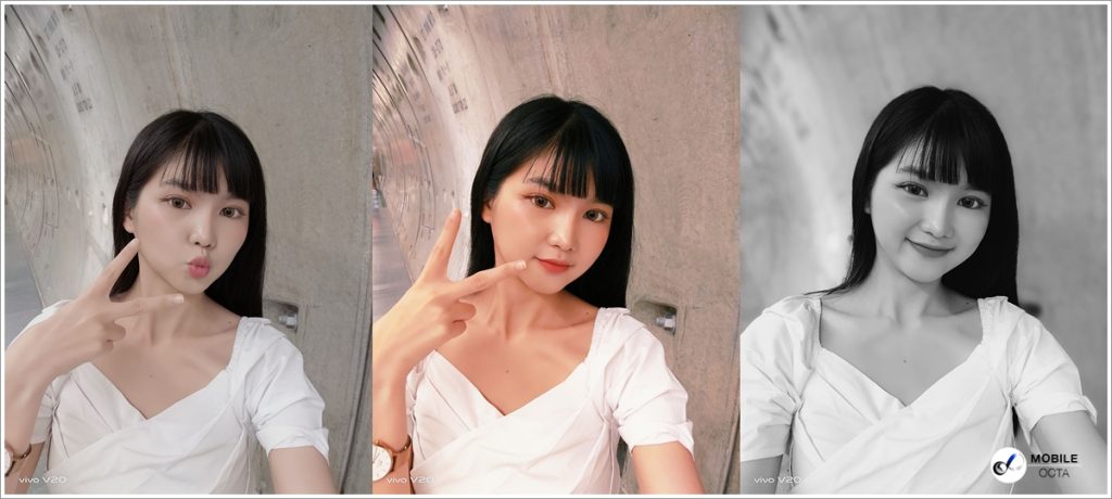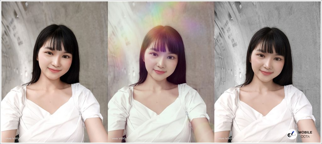 ฟีเจอร์ Portrait light effect จะช่วยเสริมให้การถ่ายภาพบุคคลมีความน่าตื่นตาตื่นใจ โดยจะให้ฟิลลิ่งที่แปลกใหม่โดยไม่ต้องพึงพาอุปกรณ์เสริม ตัวอัลกอริทึม AI ของ Vivo V20 จะปรับภาพใบหน้าสองมิติให้กลายเป็นสามมิติ และปรับแสงที่ใบหน้า ให้ภาพออกมามีความโดดเด่น ซึ่งเราสามารถเลือกเอฟเฟ็กต์ได้ทั้งแบบ 6 รูปแบบประกอบด้วย Natural light, Studio light, Stereo light, Loop light, Rainbow light, และ Monochrome background