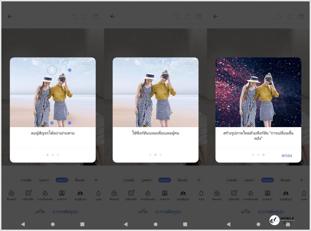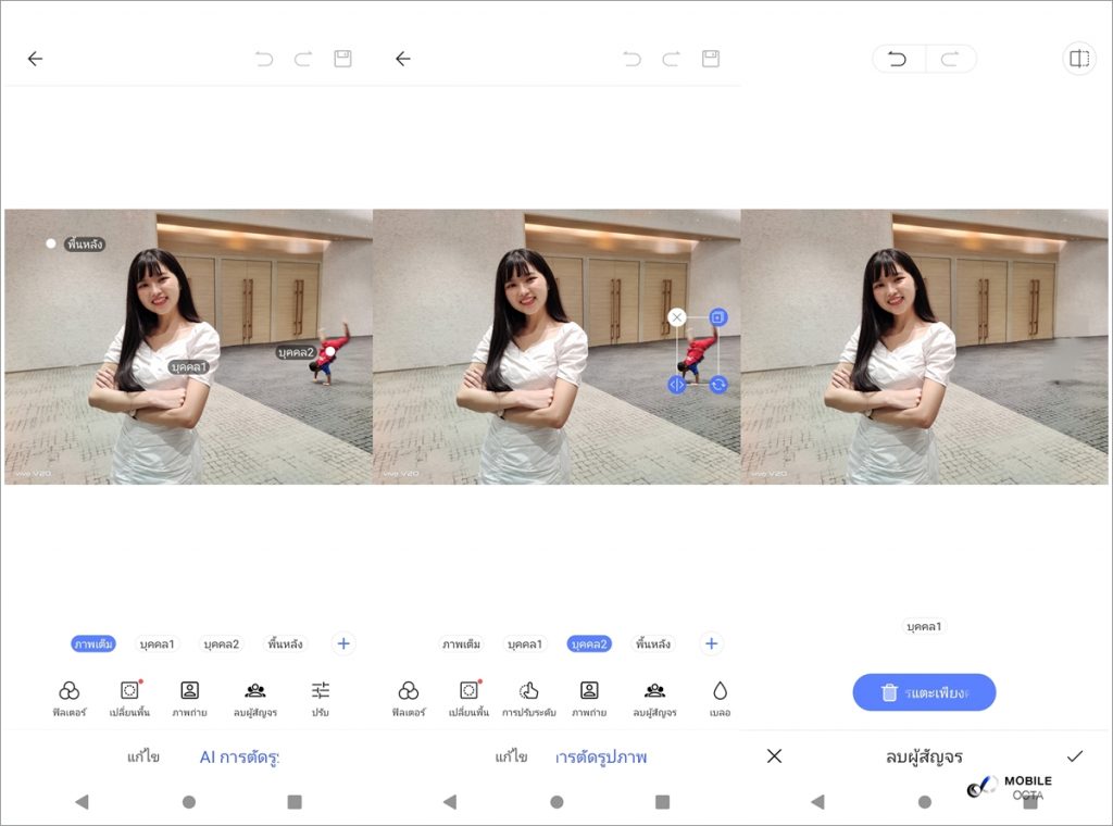 จากภาพต้นฉบับ จะเห็นว่ามีบุคคลอื่นอยู่ในเฟรม ซึ่งเราสามารใช้ฟีเจอร์ AI Image Matting ลบบุคคลที่ไม่ต้องการออกไปได้ง่าย ๆ เพียงคลิ๊กเดียว และยังสามารถเปลี่ยนภาพพื้นหลัง พร้อมย่อ/ขยาย ขยับรูปภาพบุคคลไปยังตำแหน่งอื่น ๆ ได้อย่างอิสระอีกด้วย