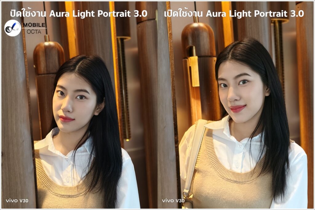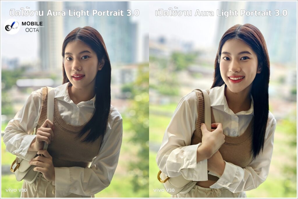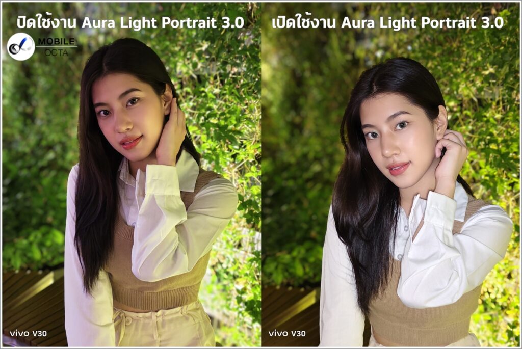 Aura Light Portrait 3.0 สามารถใช้งานได้ทุกสภาพแสง รวมถึงในช่วงเวลากลางวันก็ตาม ซึ่งจากรูปตัวอย่างเป็นการถ่ายภาพย้อนแสงภายในอาคาร ถึงแม้จะมีโหมด HDR ที่ช่วยเปลี่ยนสภาพแสง แต่จากรูปทางซ้ายมือจะเห็นว่าใบหน้าของแบบมีความฟุ้งและติดโทนคล้ำ ส่วนรูปทางขวามือเปิดใช้งาน Aura Light Portrait 3.0 จะได้ความสว่างและภาพที่ดูมิติขึ้นมา ซึ่งสามารถนำไปใช้งานโดยไม่ต้องตกแต่งในภายหลังแต่อย่างใด