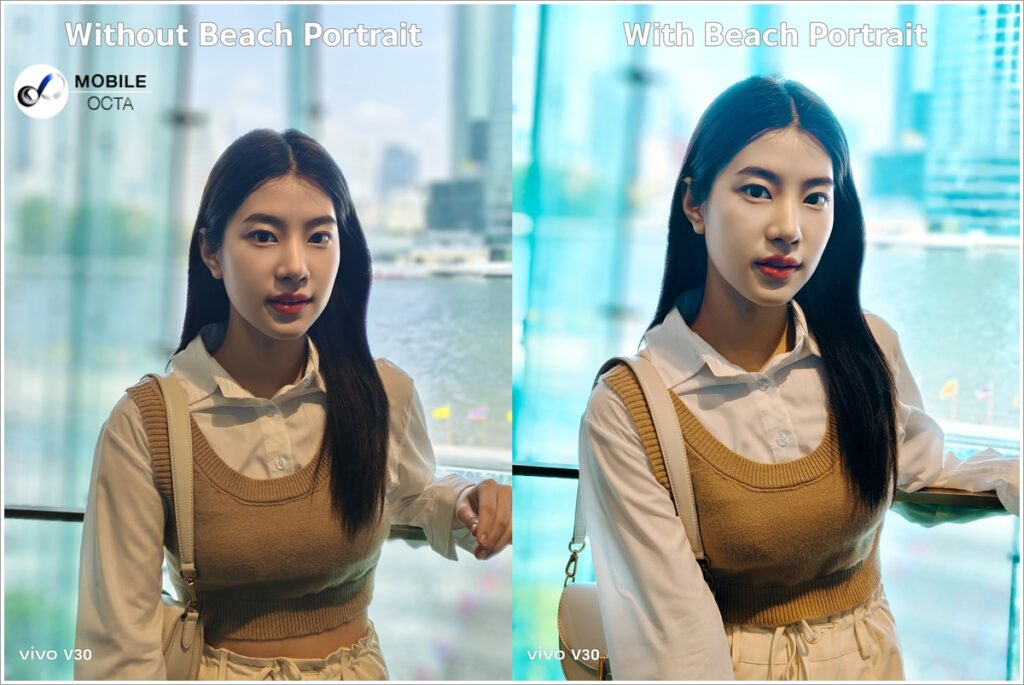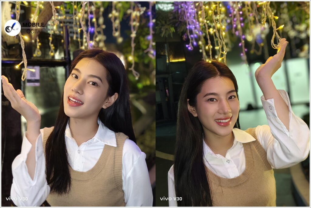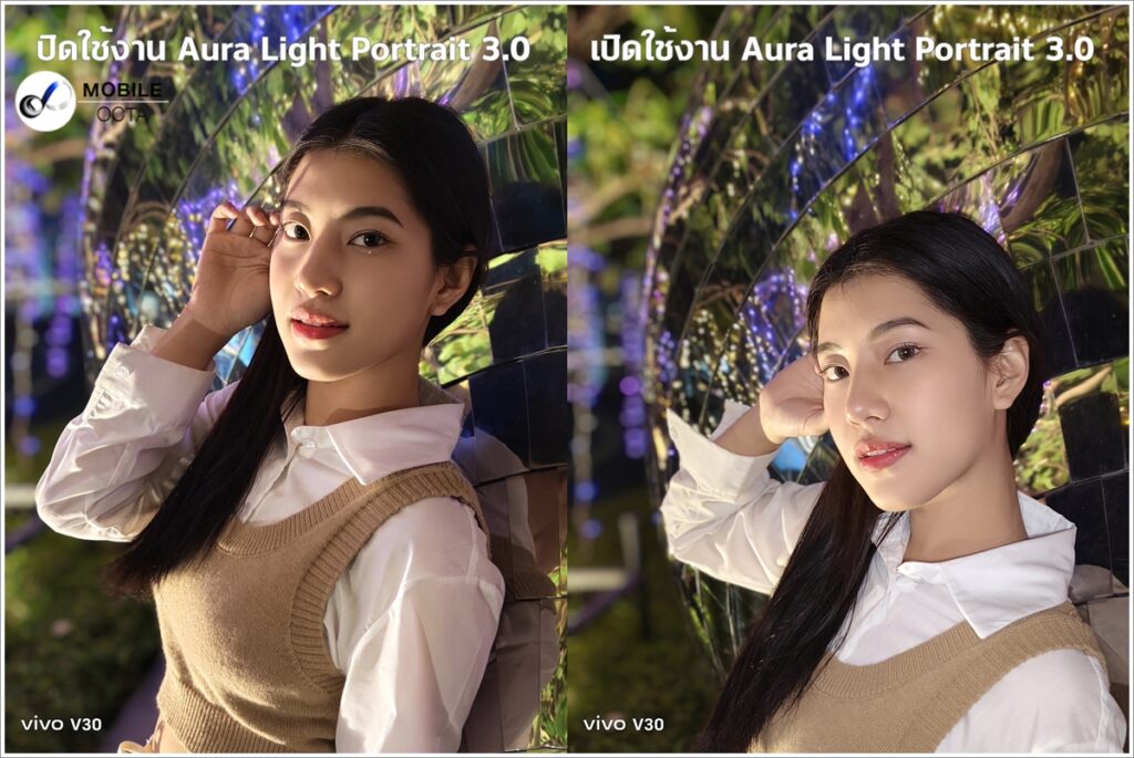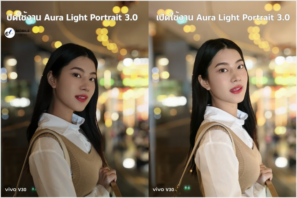 แต่จากรูปทางขวาที่ถ่ายด้วย vivo V30 5G พร้อมเปิดใช้งาน “Aura Light Portrait 3.0” จะให้สีสันที่ดูเป็นธรรมชาติและสมจริงกว่าอย่างเห็นได้ชัดเจน