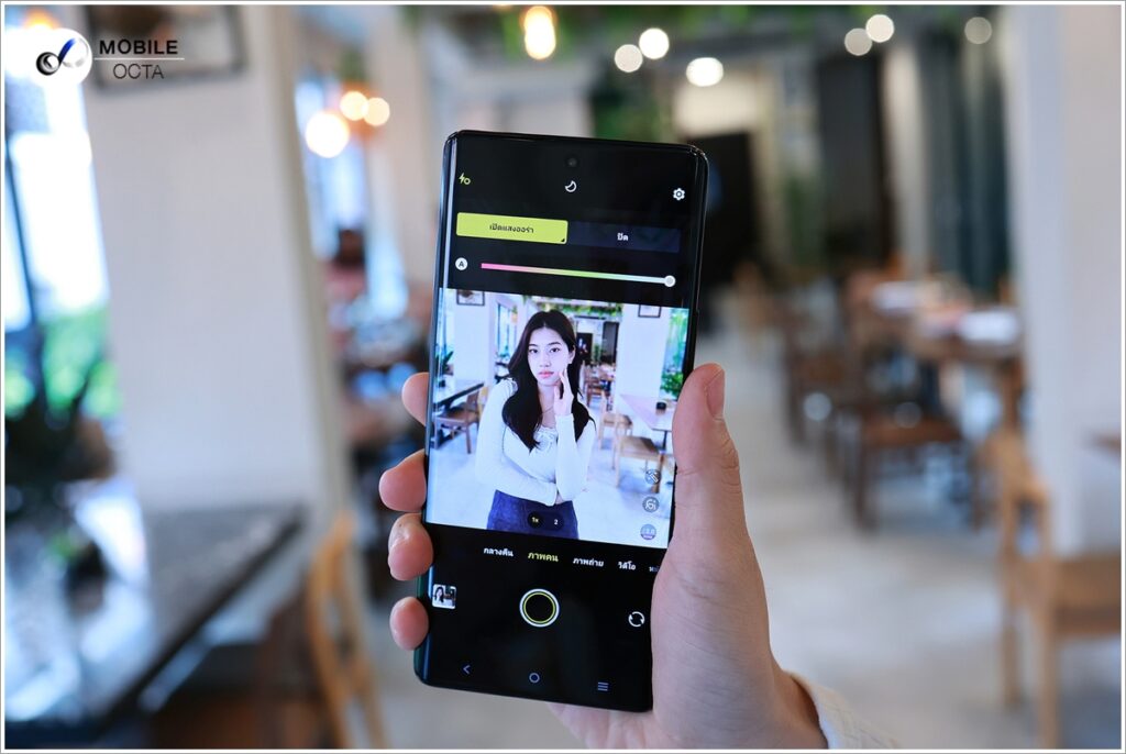 สำหรับวิธีเปิดใช้งาน Aura Light Portrait 3.0 แบบกำหนดค่าเอง ให้แตะที่สัญลักษณ์รูปแฟลชที่ด้านบนมุมซ้ายของจอแสดงผล หลังจากนั้นจะมีแถบเมนูในการเปิด/ปิดใช้งาน Aura Light Portrait 3.0 แสดงผลขึ้นมา ถัดลงมาด้านล่าง จะมีบาร์ที่ใช้ในการกำหนดรูปแบบของแสง โดยค่าเริ่มต้นจะเป็นแบบอัตโนมัติ ถ้าต้องการตั้งค่าเองให้แตะที่สัญลักษณ์รูปตัว A จากนั้นจะสามารถเลื่อนแถบบาร์ไปทางขวาเพื่อปรับเป็นอุณหภูมิเย็น และปรับมาซ้ายจะเป็นการเลือกอุณหภูมิอุ่น