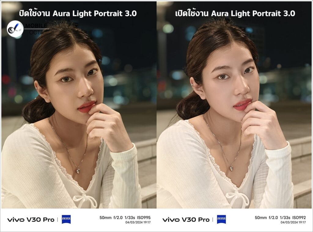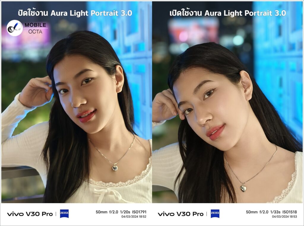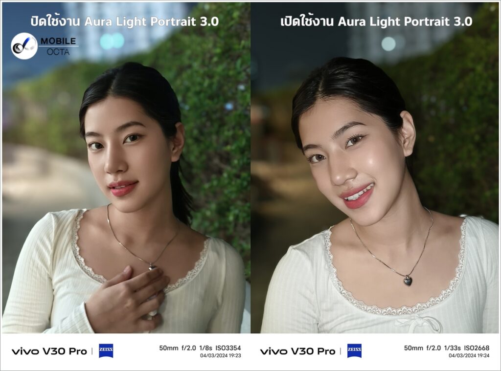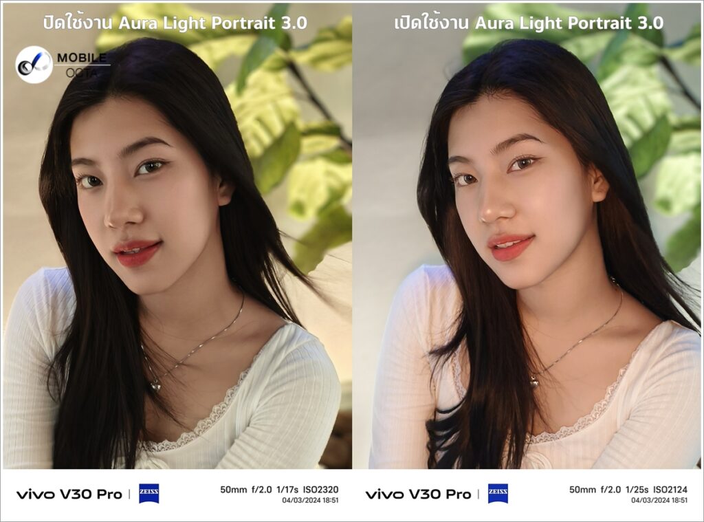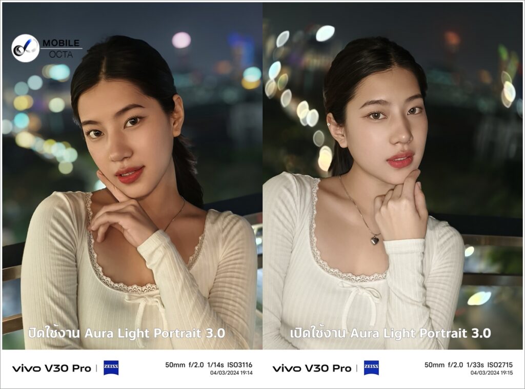 มาถึงตรงนี้เราจะเห็นได้ว่า vivo V30 Pro 5G มาพร้อมความโดดเด่นที่ยกระดับขึ้นไปอีกขั้น ด้วยเลนส์โปรจากความร่วมมือระหว่าง vivo และค่าย ZEISS ทั้งในระดับ Hardware และ Software เมื่อผสานกับแสงออร่ารุ่นอัปเกรดใหม่ล่าสุด “Aura Light Portrait 3.0” ที่ได้ถูกออกแบบมาเพื่อการถ่ายภาพบุคคลในยามค่ำคืนได้ดีขึ้นกว่ารุ่นก่อนหน้า ส่งผลให้ไม่ว่าจะแสงน้อยแค่ไหน vivo V30 Pro 5G ก็สามารถถ่ายพอร์ตเทรตได้อย่างยอดเยี่ยม ทั้งการสร้างมิติของภาพ ดึงดีเทลที่ขาดหายให้กลับมา พร้อมมอบความสมดุลสมจริงให้กับภาพบุคคลที่ไม่สามารถพบเจอได้บนสมาร์ตโฟนทั่ว ๆ ไป และเมื่อจับคู่กับคุณภาพเลนส์ระดับโปรของ ZEISS นี่จึงเป็นการยกระดับการถ่ายภาพ Portrait ที่ดีที่สุดของ V Series อย่างที่ไม่เคยมีมาก่อน