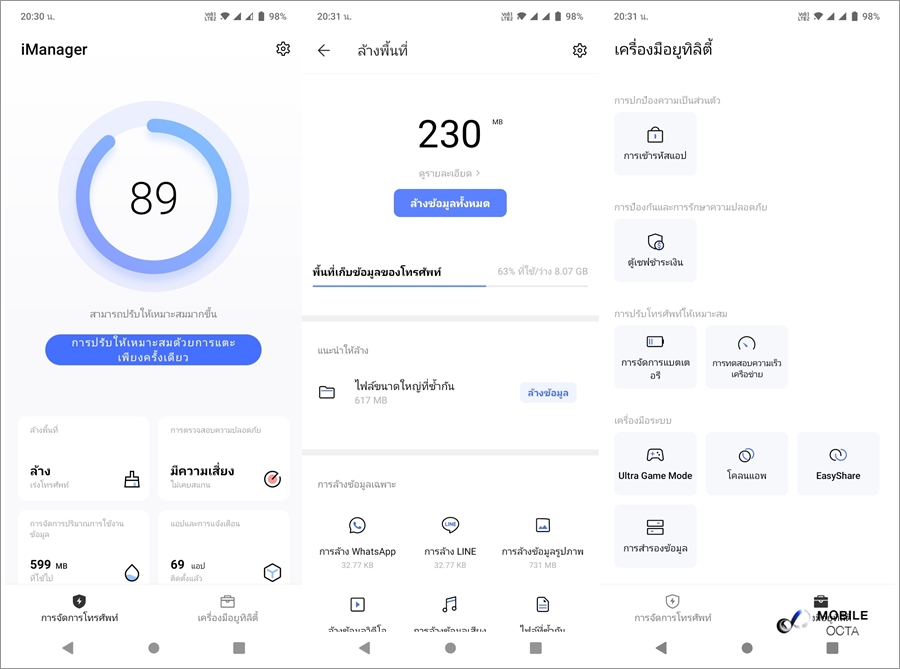 ใช้งานได้เต็มประสิทธิภาพและปลอดภัย ด้วยผู้ช่วยอัฉริยะ i-Manager ที่มาพร้อมความสามารถครบครัน ทั้งสแกนไวรัส, ลบไฟล์ขยะ, การเข้ารหัสแอป, สำรองข้อมูลและจัดการด้านพลังงานเป็นต้น