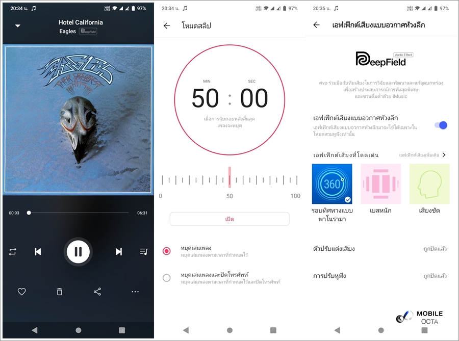 Music Player นอกจากจะมีหน้าตาสวยงามแล้ว ยังมาพร้อมจุดเด่นด้าน Software ด้วยฟีเจอร์ DeepField เอฟเฟ็กต์เสียงที่พัฒนาโดย Vivo ทำให้เสียงที่ได้มีความนุ่มลึก คมชัดใสเคลียร์ รองรับการจำลองระบบเสียงรอบทิศทาง 360 องศา อีกทั้งยังปรับแต่งเสียงผ่าน EQ ได้ยืดหยุ่นและตรงใจผู้ใช้งานได้มากยิ่งขึ้น