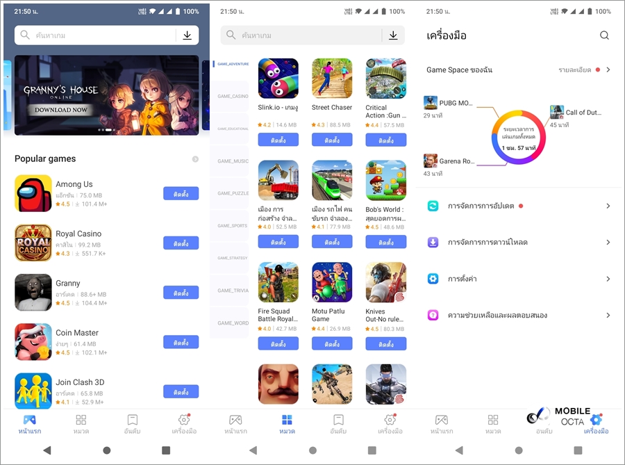 Game Center เป็นอีกหนึ่งฟีเจอร์ใหม่ โดยเป็นศูนย์รวมของเกมที่น่าสนใจ มีการแบ่งหมวดหมู่ไว้อย่างชัดเจน ทำให้ง่ายต่อการค้นหาและดาวน์โหลด นอกจากนี้ Game Space ยังมาพร้อมความสามารถในการเข้าถึงข้อมูลสำคัญในระหว่างการเล่นเกม เช่น ดูข้อมูล CPU อุณหภูมิ และปริมาณข้อมูลการใช้งาน โดยทำงานร่วมกับ Ultra Game Mode ที่สามารถปิดข้อความ และการแจ้งเตือนต่าง ๆ ในขณะเล่นเกม ให้คุณสามารถมุ่งเน้นไปกับการเล่นเกมได้อย่างเต็มที่
