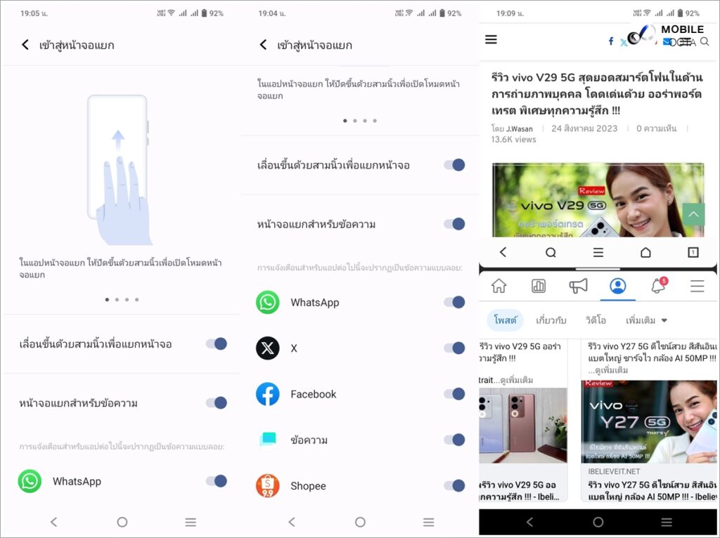 โหมดใช้งานมือเดียวและการจับภาพหน้าจอที่มีความหลากหลาย สำหรับการจับภาพหน้าจอก็ถือว่าเป็นอีกหนึ่งฟีเจอร์พิเศษของ vivo โดยสามารถจับภาพหน้าจอได้ยืดหยุ่นมาก ๆ ทั้งการลาก 3 นิ้วขึ้นไปจากหน้าจอแสดงผล