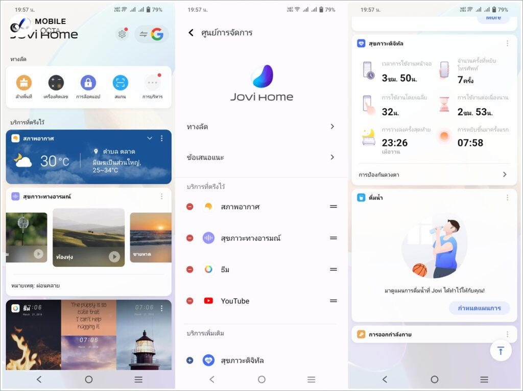 เมื่อเลื่อนหน้าจอจากด้านซ้ายไปยังด้านขวาของหน้าโฮมเพจ จะเข้าสู่ Jovi Home ซึ่งเป็นหน้าหลักที่รวบรวมแอปพลิเคชันทั้งหมดไว้ด้วยกัน พร้อมการออกแบบสไตล์การ์ดที่ใช้งานง่าย โดยมีไฮไลท์ที่น่าสนใจดังนี้