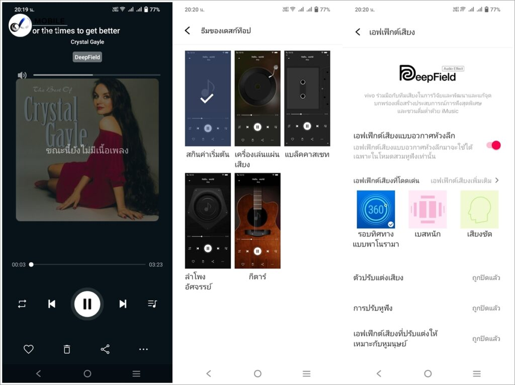 Music Player บน vivo Y17s มาพร้อมจุดเด่นด้าน Software ด้วยฟีเจอร์การเล่นเพลงที่ครอบคลุม รวมถึงยังมี DeepField เอฟเฟ็กต์เสียงที่พัฒนาโดย vivo ทำให้การถ่ายทอดเสียงที่ได้มีความนุ่มลึก คมชัดใสเคลียร์ รองรับการจำลองระบบเสียงรอบทิศทาง 360 องศา อีกทั้งยังปรับแต่งเสียงผ่าน EQ ได้ยืดหยุ่นและตรงใจผู้ใช้งานได้มากยิ่งขึ้นอีกด้วย