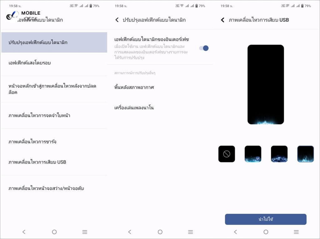Dynamic Effects จะช่วยเสริมการใช้งานสมาร์ตโฟนของเราให้ดูน่าตื่นตาตื่นใจยิ่งขึ้น โดยผู้ใช้งานสามารถเลือกเอฟเฟกต์สำหรับการตั้งค่าภาพเคลื่อนไหวเช่นเอฟเฟกต์จดจำใบหน้า และการชาร์จเป็นต้น