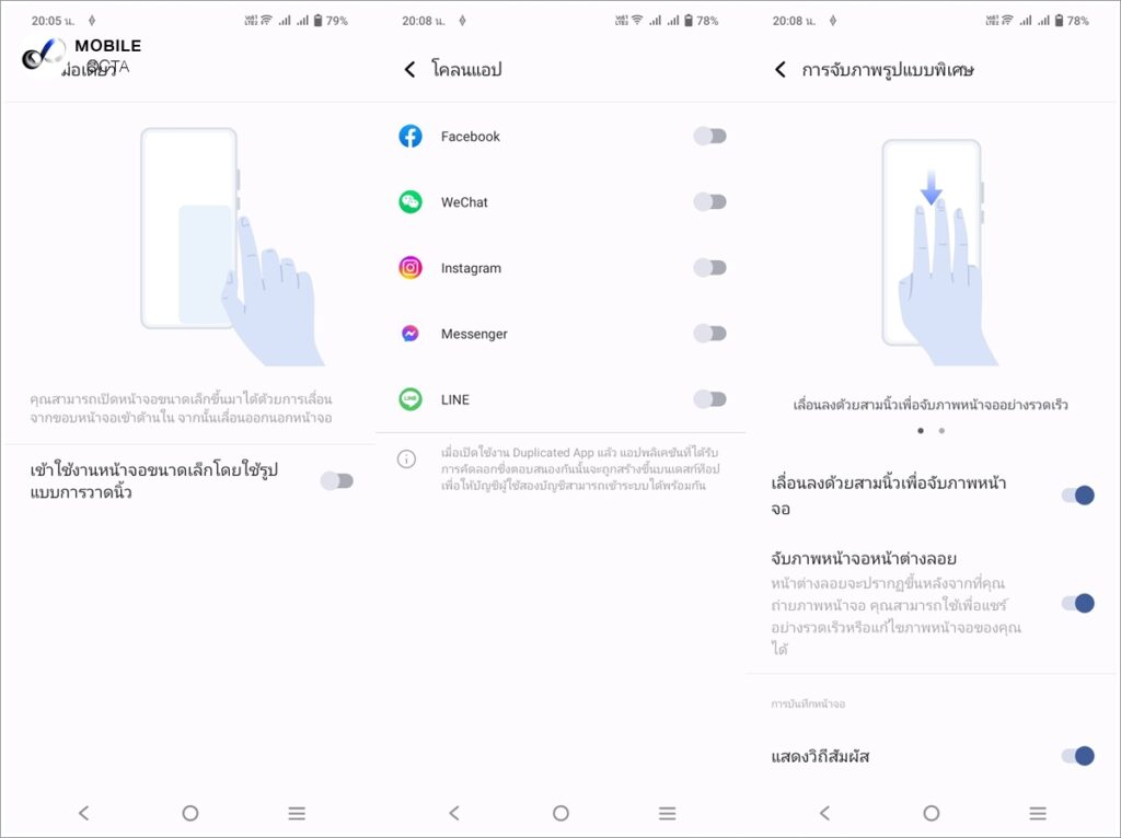รวมไปถึงการจับภาพหน้าจอแบบยาวๆ หรือรูปแบบอิสระ อีกทั้งยังบันทึกหน้าจอในรูปแบบของวิดีโอได้อีกด้วย และอีกหนึ่งฟีเจอร์ที่ขาดไม่ได้ก็คือแอปฯโคลน ที่รองรับการใช้งานแอปพลิเคชันโซเชียลยอดนิยม เช่น Line, Facebook หรือ Instagram ฯลฯ ได้พร้อม ๆ กันถึง 2 แอคเคาท์ในเครื่องเดียว