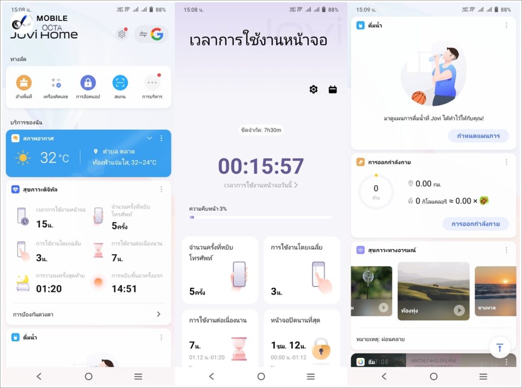 เมื่อเลื่อนหน้าจอจากด้านซ้ายไปยังด้านขวาของหน้าโฮมเพจ จะเข้าสู่ Jovi Home ซึ่งเป็นหน้าหลักที่รวบรวมแอปพลิเคชันทั้งหมดไว้ด้วยกัน พร้อมการออกแบบสไตล์การ์ดที่ใช้งานง่าย โดยมีไฮไลท์ที่น่าสนใจดังนี้