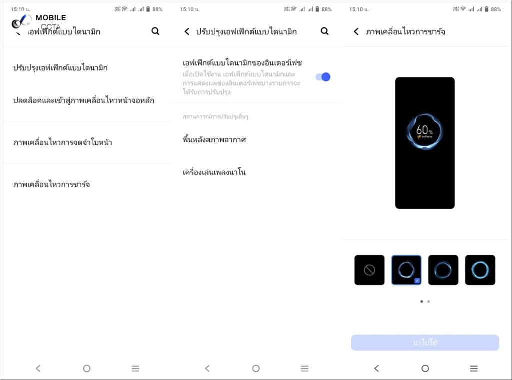 Dynamic Effects จะช่วยเสริมการใช้งานสมาร์ตโฟนของเราให้ดูน่าตื่นตาตื่นใจยิ่งขึ้น โดยผู้ใช้งานสามารถเลือกเอฟเฟกต์สำหรับการตั้งค่าภาพเคลื่อนไหวเช่นเอฟเฟกต์จดจำใบหน้า และการชาร์จเป็นต้น