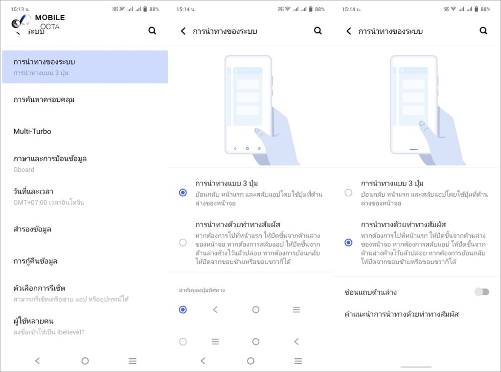 สำหรับปุ่มนำทาง สามารถปรับตั้งค่าให้เหมาะกับความถนัดของเราได้ตามที่ต้องการ นอกจากนี้ยังมี Full Screen gesture ที่มาพร้อมฟีเจอร์สั่งการง่าย ๆ และสามารถใช้งานจอแสดงผลได้แบบเต็ม 100%