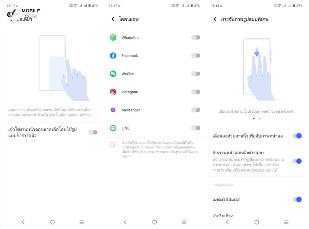 รวมไปถึงการจับภาพหน้าจอแบบยาวๆ หรือรูปแบบอิสระ อีกทั้งยังบันทึกหน้าจอในรูปแบบของวิดีโอได้อีกด้วย และอีกหนึ่งฟีเจอร์ที่ขาดไม่ได้ก็คือแอพโคลน ที่รองรับการใช้งานแอปพลิเคชันโซเชียลยอดนิยม เช่น Line, Facebook หรือ Instagram ฯลฯ ได้พร้อม ๆ กันถึง 2 แอคเคาท์ในเครื่องเดียว