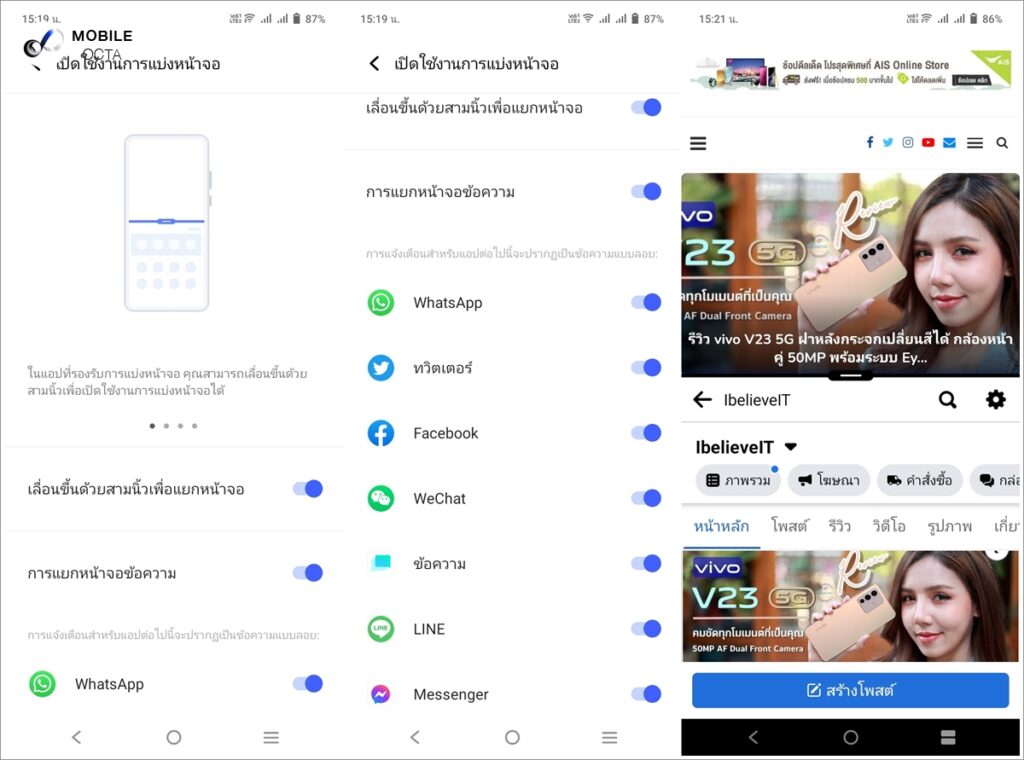 ซึ่งบน vivo Y21T นั้นเรียกใช้งานการแบ่งหน้าจอได้ง่าย ๆ เพียงลาก 3 นิ้วจากด้านล่างขึ้นไปยังด้านบนของจอแสดงผล ก็จะสามารถใช้งาน 2 แอปฯในหนึ่งหน้าจอได้ในทันที