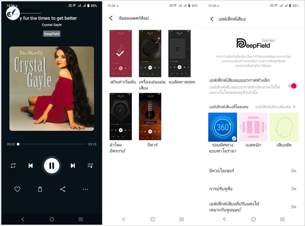 Music Player บน vivo Y21T มาพร้อมจุดเด่นด้าน Software ด้วยฟีเจอร์ DeepField เอฟเฟ็กต์เสียงที่พัฒนาโดย vivo ทำให้การถ่ายทอดเสียงที่ได้มีความนุ่มลึก คมชัดใสเคลียร์ รองรับการจำลองระบบเสียงรอบทิศทาง 360 องศา อีกทั้งยังปรับแต่งเสียงผ่าน EQ ได้ยืดหยุ่นและตรงใจผู้ใช้งานได้มากยิ่งขึ้น สำหรับคนที่ชื่นชอบการฟังเพลง vivo Y21T นั้นไม่ทำให้ผิดหวังอย่างแน่นอน