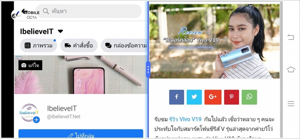 ซึ่งบน Vivo Y50 นั้นเรียกใช้งานการแบ่งหน้าจอได้ง่าย ๆ เพียงลาก 3 นิ้วจากด้านล่างขึ้นไปยังด้านบนของจอแสดงผล ก็จะสามารถใช้งาน 2 แอปฯในหนึ่งหน้าจอได้ในทันที