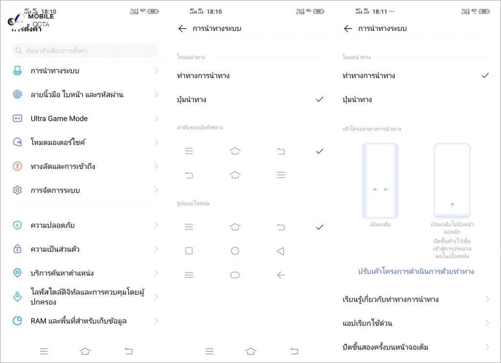 สำหรับปุ่มนำทาง สามารถปรับตั้งค่าให้เหมาะกับความถนัดของเราได้ตามที่ต้องการ นอกจากนี้ยังมี Full Screen gesture ที่มาพร้อมฟีเจอร์สั่งการง่าย ๆ และสามารถใช้งานจอแสดงผลได้แบบเต็ม 100%