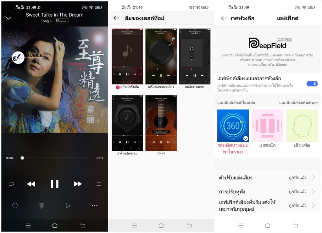 Music Player นอกจากจะมีหน้าตาสวยงามแล้ว ยังมาพร้อมจุดเด่นด้าน Software ด้วยฟีเจอร์ DeepField เอฟเฟ็กต์เสียงที่พัฒนาโดย Vivo ทำให้เสียงที่ได้มีความนุ่มลึก คมชัดใสเคลียร์ รองรับการจำลองระบบเสียงรอบทิศทาง 360 องศา อีกทั้งยังปรับแต่งเสียงผ่าน EQ ได้ยืดหยุ่นและตรงใจผู้ใช้งานได้มากยิ่งขึ้น สำหรับคนที่ชื่นชอบการฟังเพลง Vivo Y50 นั้นไม่ทำให้ผิดหวังอย่างแน่นอน