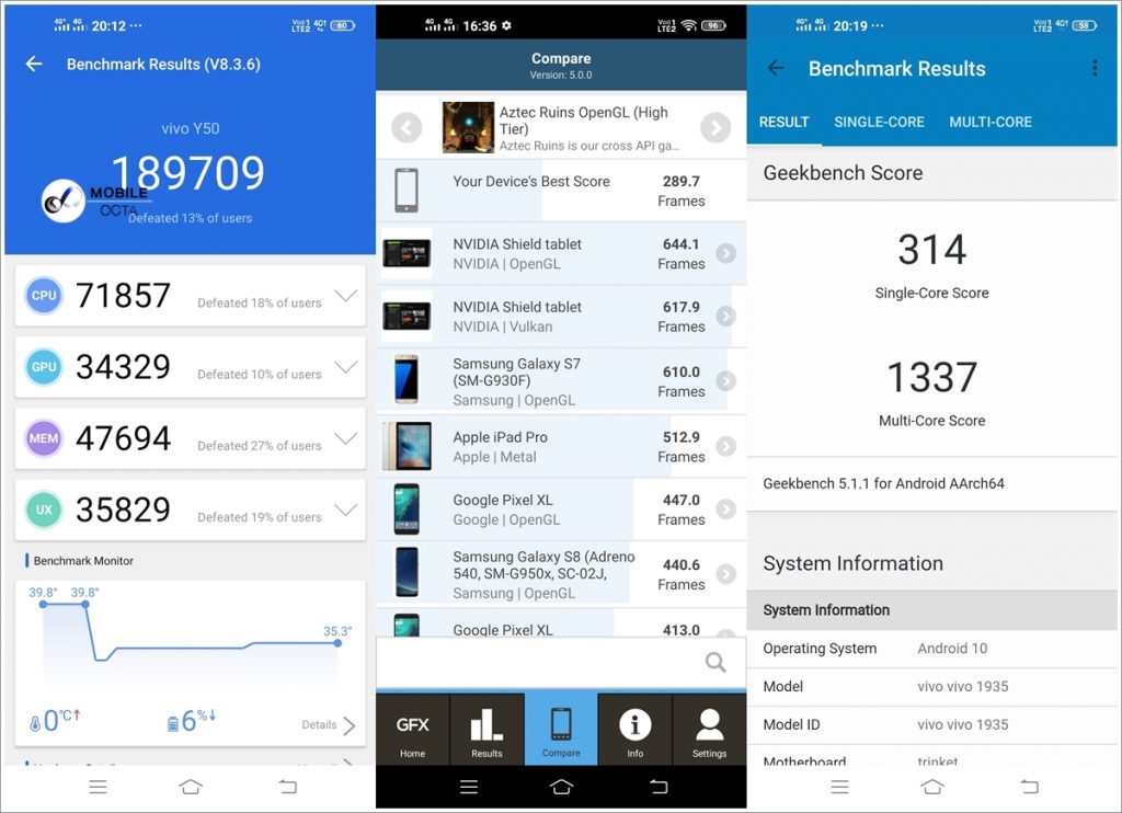 Vivo Y50 ขับเคลื่อนด้วยชิปเซ็ต Qualcomm SM6125 Snapdragon 665 บนสถาปัตยกรรม 11 นาโนเมตร ประมวลผล Octa-core (4×2.0 GHz Kryo 260 Gold & 4×1.8 GHz Kryo 260 Silver) เมื่อทำงานร่วมกับ RAM 8GB จึงส่งผลให้สามารถรีดประสิทธิภาพออกมาได้อย่างเต็มศักยภาพ และเมื่อดูจากผลคะแนนแล้วจะเห็นว่าแรงกว่า snapdragon 660 ถึง 2 เท่าเลยทีเดียว