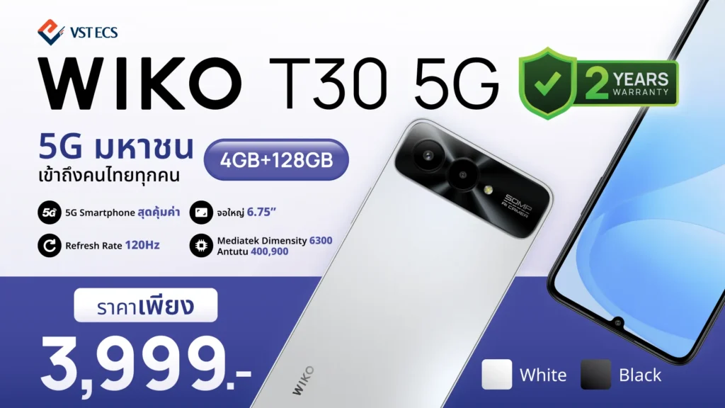สวัสดีครับแฟน ๆ MobileOcta ทุกท่าน! วันนี้เรามีสมาร์ตโฟนรุ่นใหม่ที่สร้างแรงกระเพื่อมในตลาดมือถือระดับเริ่มต้นมาฝากกัน นั่นก็คือ WIKO T30 5G สมาร์ตโฟนที่ทาง VST ECS (ประเทศไทย) นำเข้ามาบุกตลาดด้วยสโลแกน “มือถือ 5G มหาชน” เพราะเปิดตัวมาในราคาที่ทุกคนสามารถเข้าถึงได้เพียง 3,999 บาท เท่านั้น!