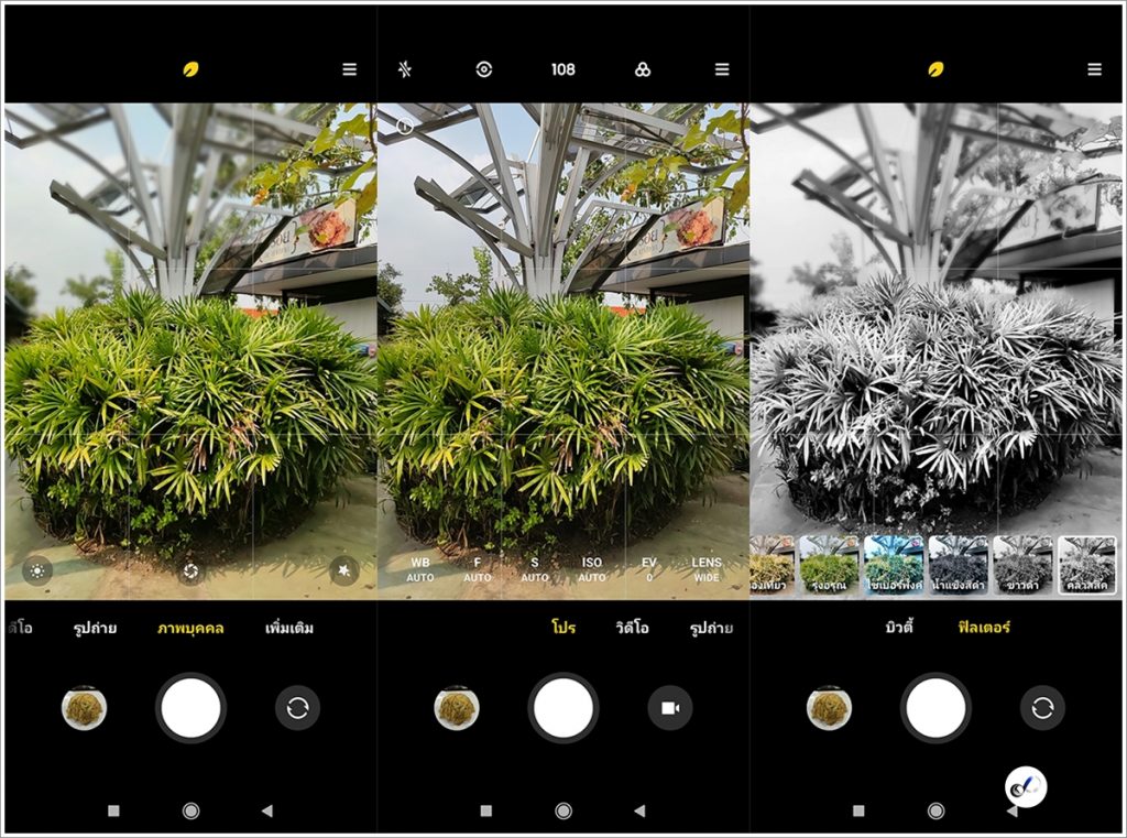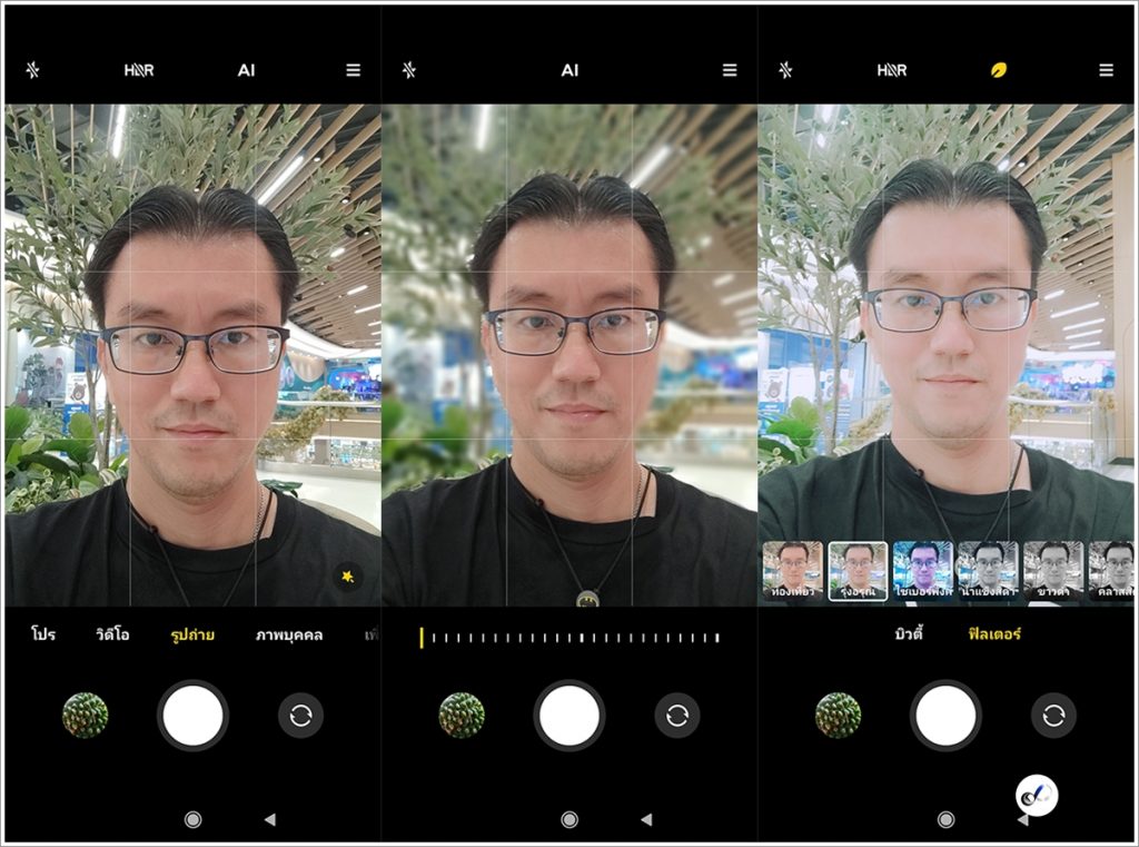 โดยหน้าตา UI ของกล้องใช้งานง่าย ด้านบนมีแถบเมนูเปิดปิดไฟแฟลชอัตโนมัติ, เปิดปิดโหมด HDR, เปิดปิดโหมด AI, เลือกปรับโหมดบิวตี้/ฟิลเตอร์, เปิดใข้งาน Google Lens และตั้งค่าการใช้งานกล้องต่างๆ