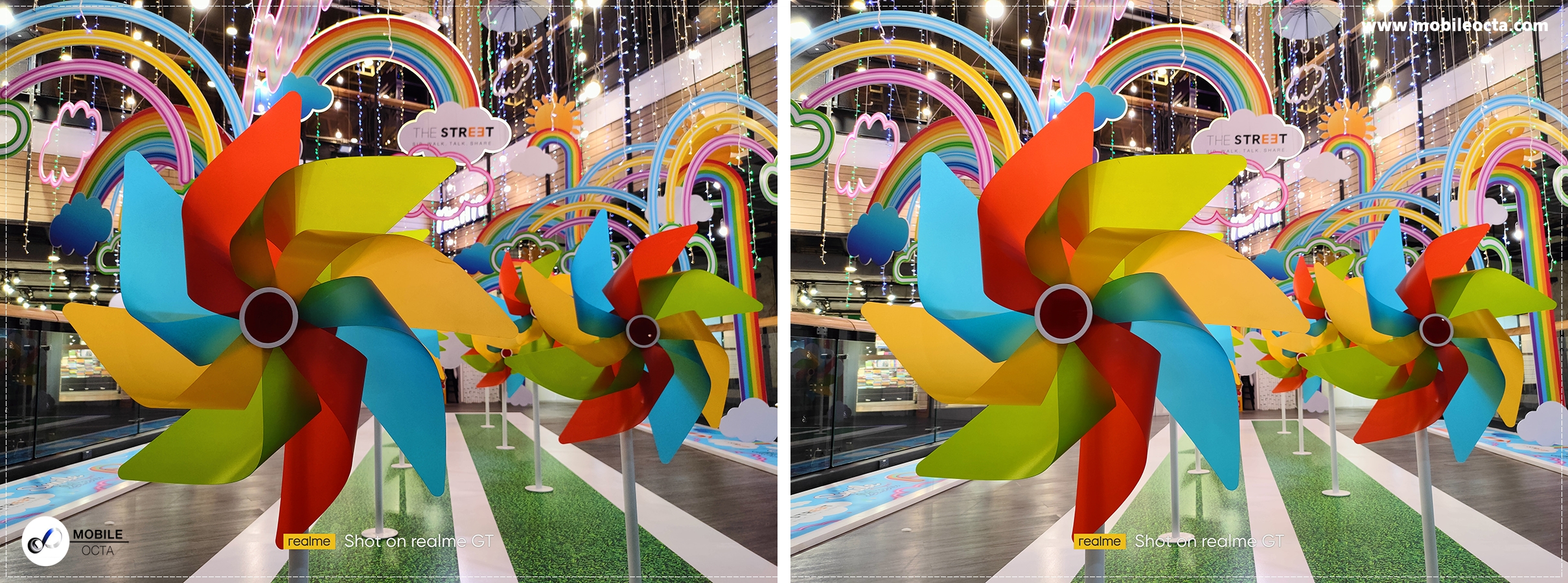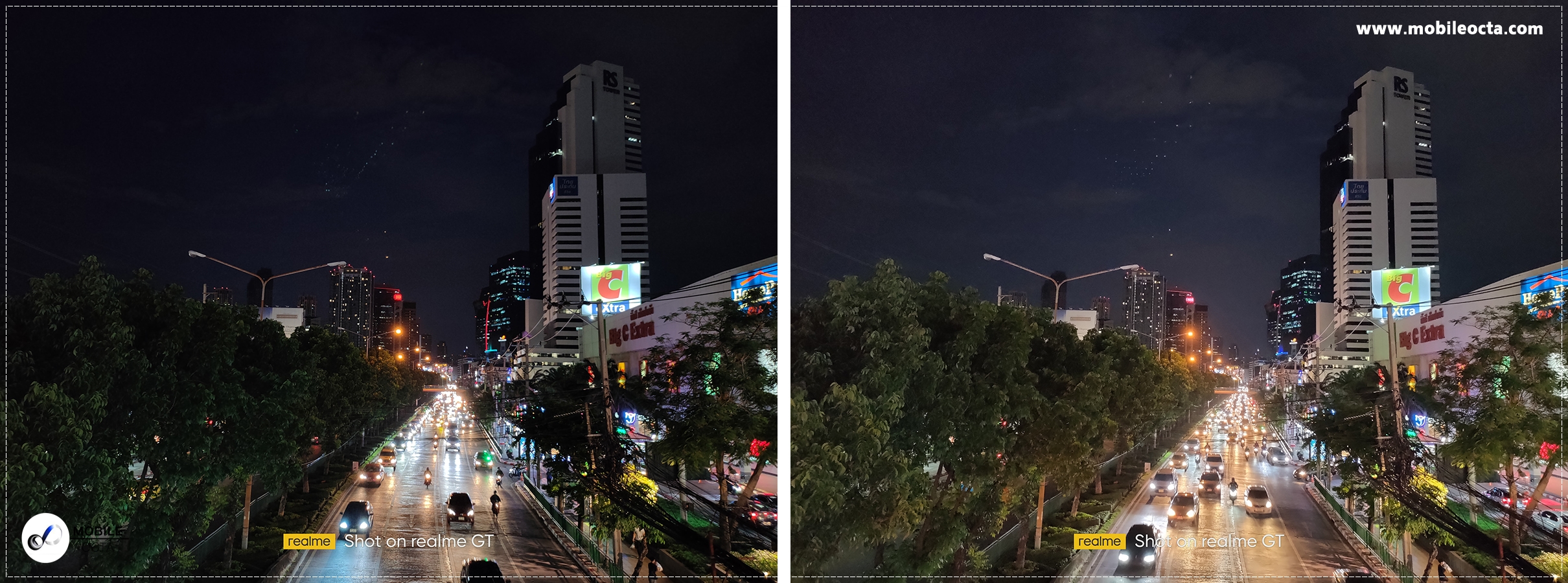 ทดสอบกล้องหลังในโหมด Super Nightscape โดยภาพซ้ายถ่ายด้วยโหมดปกติ ส่วนภาพขวาถ่ายด้วยโหมด Super Nightscape