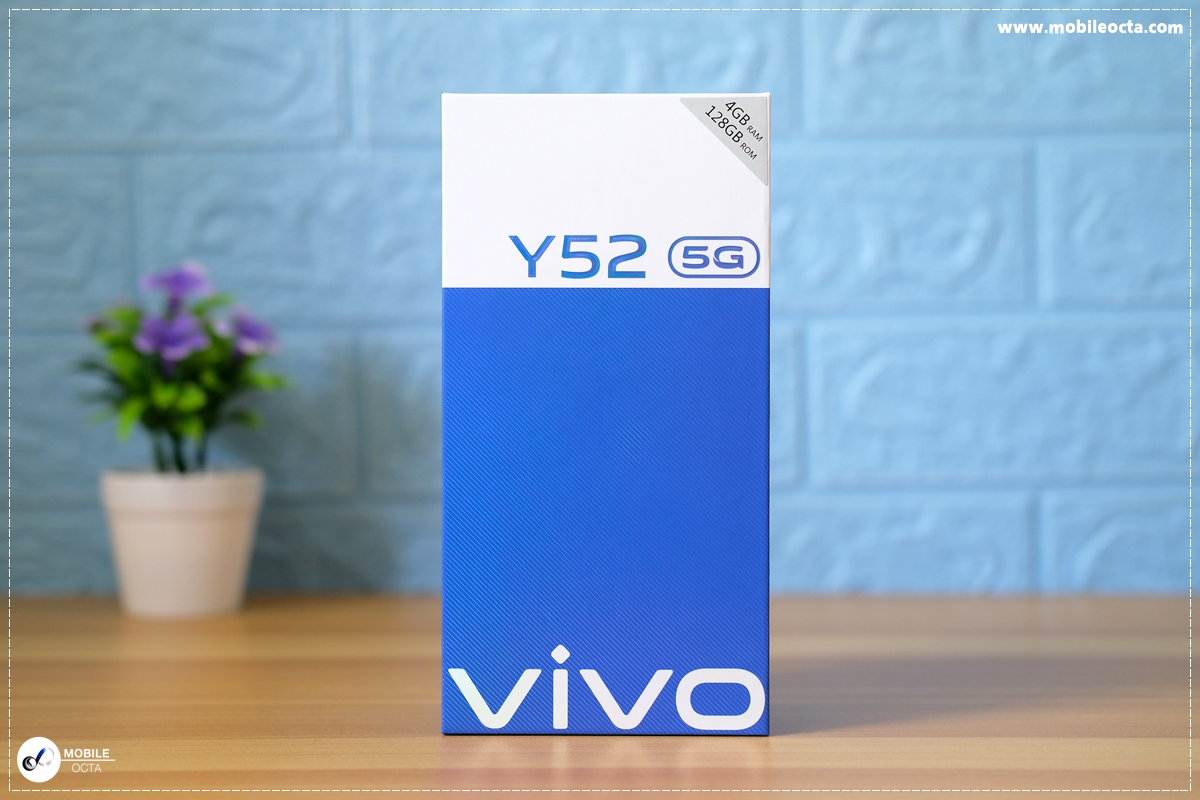 กล่องแพ็กเกจจิ้งของ vivo Y52 5G มาในโทนสีขาวตัดสีน้ำเงิน ด้านหน้ากล่องมีชื่อรุ่นขนาดใหญ่และขนาดความจุ ROM/RAM พิมพ์กำกับไว้ที่ด้านหน้า