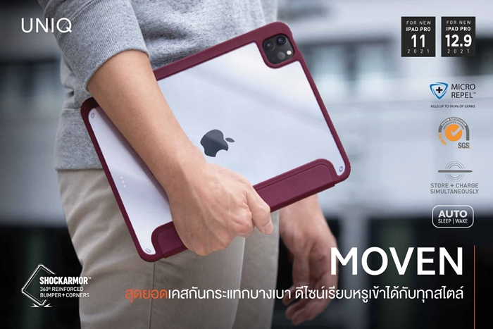 สำหรับเคส Uniq รุ่น MOVEN สำหรับ iPad Pro 11 และ iPad Pro 12.9 สุดยอดเคสกันกระแทก บางเบา ดีไซน์เรียบหรูเข้าได้กับทุกสไตล์ ทนทานเป็นพิเศษ มาพร้อมเคสใสด้านหลังแบบป้องกันรอยขีดข่วน ด้วยวัสดุ PC (Polycarbonate) มีน้ำหนักเบา ทนทานรอยขีดข่วน แข็งแรง และป้องกันแรงกระแทกได้ดี ให้ความใส คมชัดยาวนาน เพื่อโชว์ตัวเครื่อง iPad ของคุณ ในขณะเดียวกันปกป้องตัวเครื่องจากแรงกระแทกได้ด้วยกันชนShockArmor™ ที่ได้รับการออกแบบมาสำหรับเสริมความแข็งแกร่งรอบด้าน รวมถึงมุมทั้งสี่ด้านที่ได้รับการเสริมกันชนเป็นพิเศษด้วยเช่นกัน