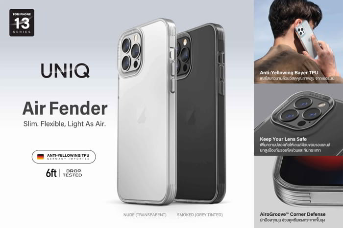 รวมถึงตัวเคสผ่านการทดสอบว่าสามารถรองรับแรงกระแทกจากการตกจากที่สูงได้ถึง 6 ฟุต อีกทั้งตัวเคสยังผลิต ด้วยวัสดุ Bayer TPU คุณภาพสูงจากเยอรมนี ผสานเทคโนโลยี FlexiClear™ ทำให้เคสมีความยืดหยุ่นสูง เคสใสยาวนานป้องกันการเกิดเคสเหลืองได้เป็นอย่างดี โดย Uniq รุ่น AIR FENDER วางจำหน่ายในราคา 590 บาท