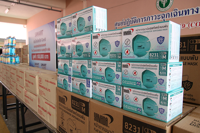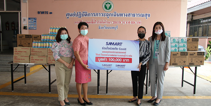 กนกวรรณ จันทร์สว่างภูวนะ (ที่ 2 จากขวา) ผู้อำนวยการฝ่ายสื่อสารองค์กร บมจ.สามารถคอร์ปอเรชั่น และนิศาชล อุดมวงศ์วิวัฒน์ ผู้อำนวยการฝ่ายทรัพยากรบุคคลและจัดซื้อ บมจ.สามารถเทลคอม มอบอุปกรณ์ทางการแพทย์ ได้แก่ หน้ากากอนามัยทางการแพทย์ (แบบ 3D) จำนวน 2,600 ชิ้น และแอลกอฮอล์ 70% จำนวน 1,000 ขวด เพื่อช่วยเพิ่มศักยภาพและความคล่องตัวในด้านการรองรับผู้ป่วย COVID-19 ให้กับโรงพยาบาลสนามในเขตจ.นนทบุรี