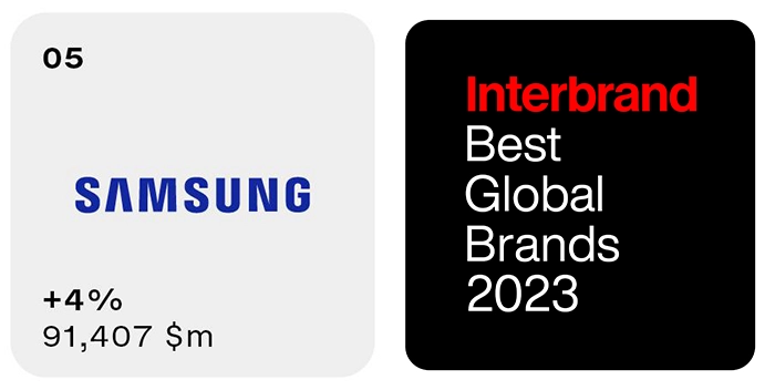 ซัมซุงได้รับการยอมรับจาก Interbrand บริษัทที่ปรึกษาด้านการสร้างแบรนด์ระดับโลก ให้เป็นหนึ่งใน “5 แบรนด์ที่ดีที่สุดในโลก” เป็นปีที่ 4 และเผยว่ามูลค่าแบรนด์ของซัมซุงได้ขยับสูงขึ้นสู่ระดับ 91,400 ล้านดอลลาร์ ซึ่งเติบโตขึ้นถึง 4% เมื่อเทียบกับปีก่อนหน้า