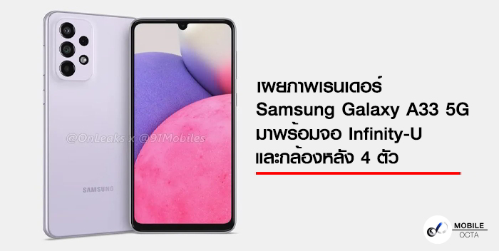 @OnLeaks แหล่งข่าวหลุดสมาร์ตโฟนชื่อดังได้ร่วมกับเว็บไซต์ 91Mobiles ออกแบบภาพเรนเดอร์ Samsung Galaxy A33 5G ด้วยโปรแกรม CAD เผยให้เห็นดีไซน์ตัวเครื่องที่คล้ายกับ Galaxy A32 4G โดยด้านหน้ามาพร้อมหน้าจอ Infinity-U ติดตั้งกล้องเซลฟี่ที่ตรงกลางด้านบน